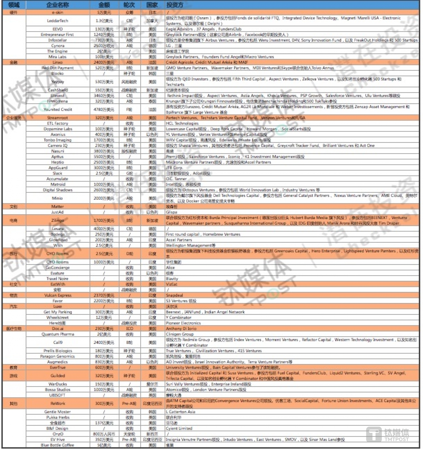 - 具体领域分布如下:企业服务8起,电商,金融,硬件各3起,物流,医疗生物各2起,旅行1起,其它2起。