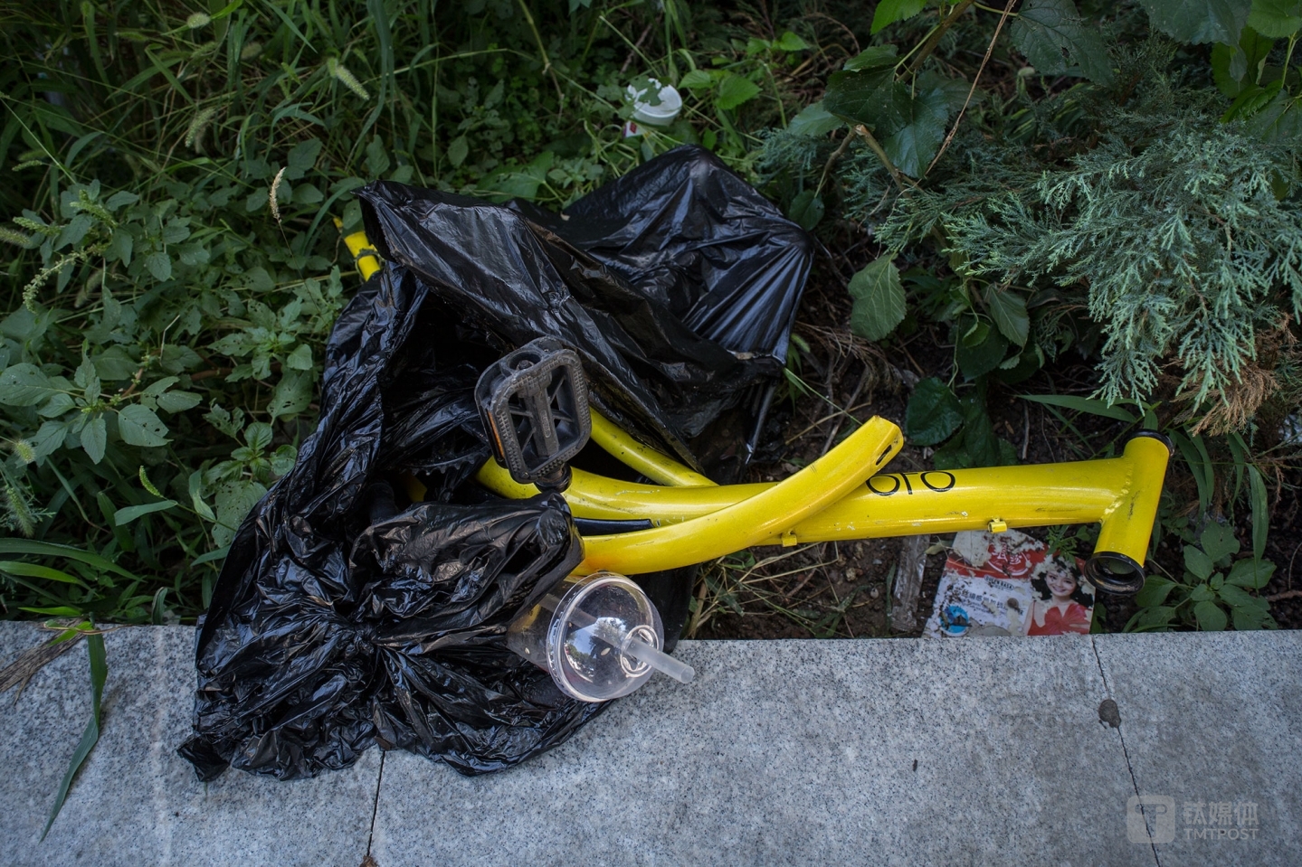 【抛尸】 北京朝阳,遭肢解的小黄车只剩车身,它们被黑色塑料袋包裹后,被抛弃到绿化带。现场如同凶案中的抛尸。