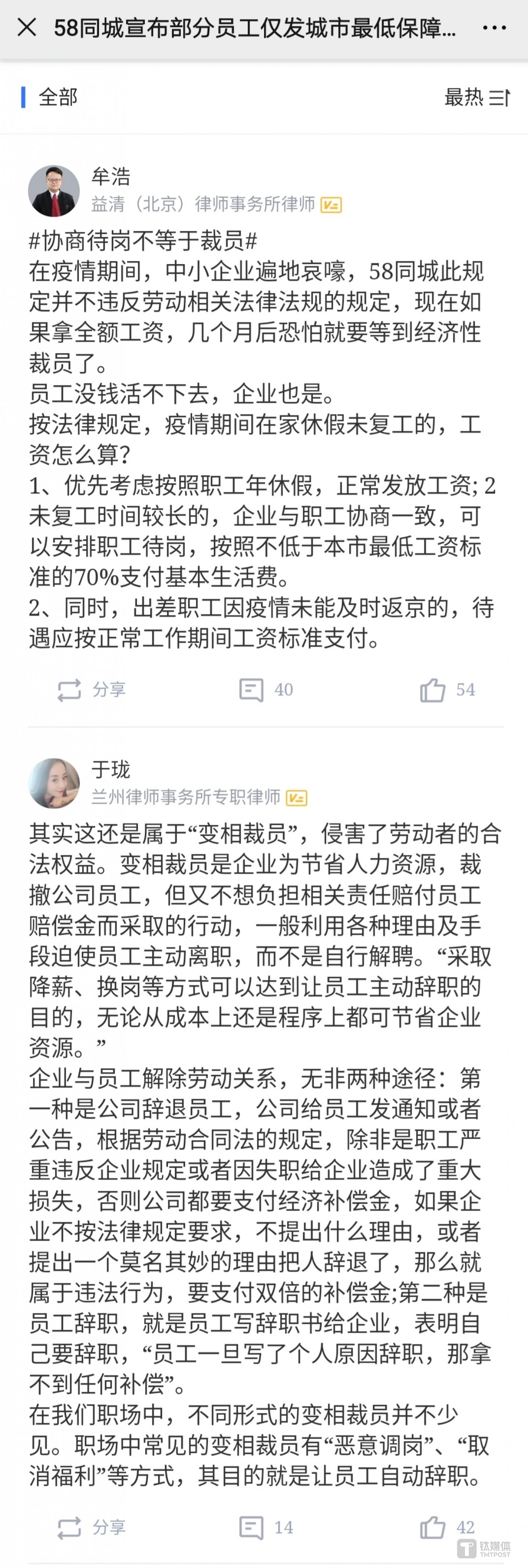 在热门评论区,有认证的益清(北京)律师事务所律师表示,协商待岗不等于裁员。他认为,“在疫情期间,中小企业遍地哀嚎,58同城此规定并不违反劳动相关法律法规的规定,现在如果拿全额工资,几个月后恐怕就要等到经济性裁员了。”