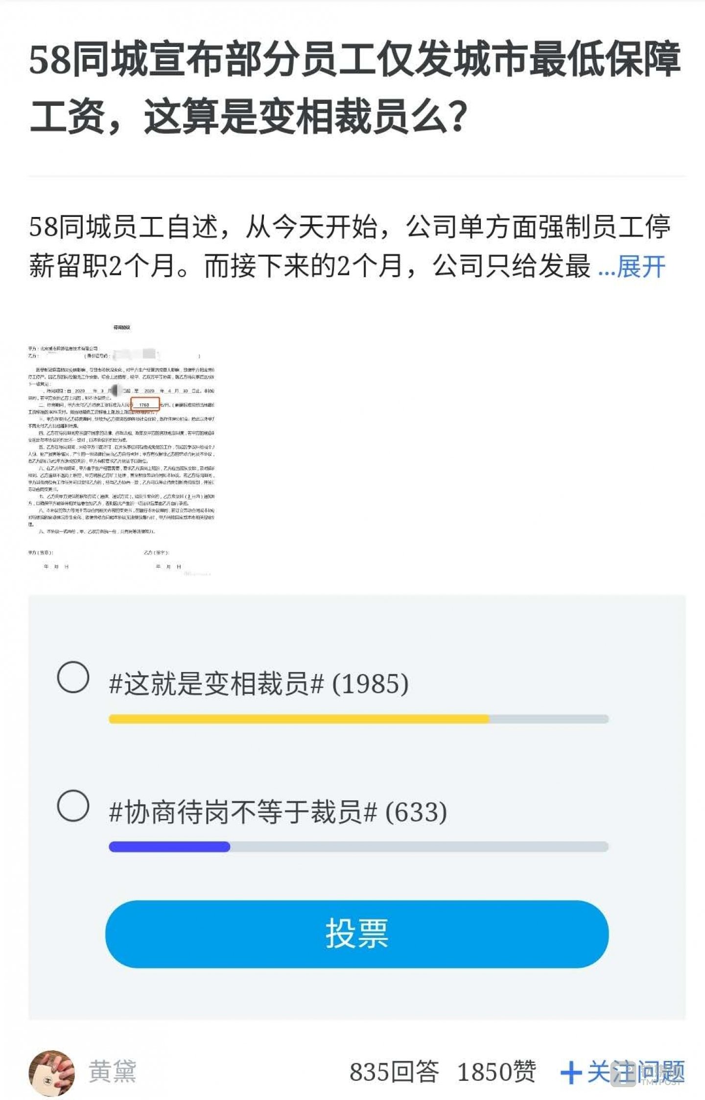 而在新一轮的裁员传闻风波中,停薪留职或等同于变相裁员引发争议。有不少员工认为58同城此举是为了让员工自行辞职,以逃避N+1的补偿。在“58同城宣布部分员工仅发城市最低保障工资,这算是变相裁员么?”的投票中,更有1960人认为58同城此举就是变相裁员,占投票总数超75%,仅有623人认为协商待岗不等于裁员。