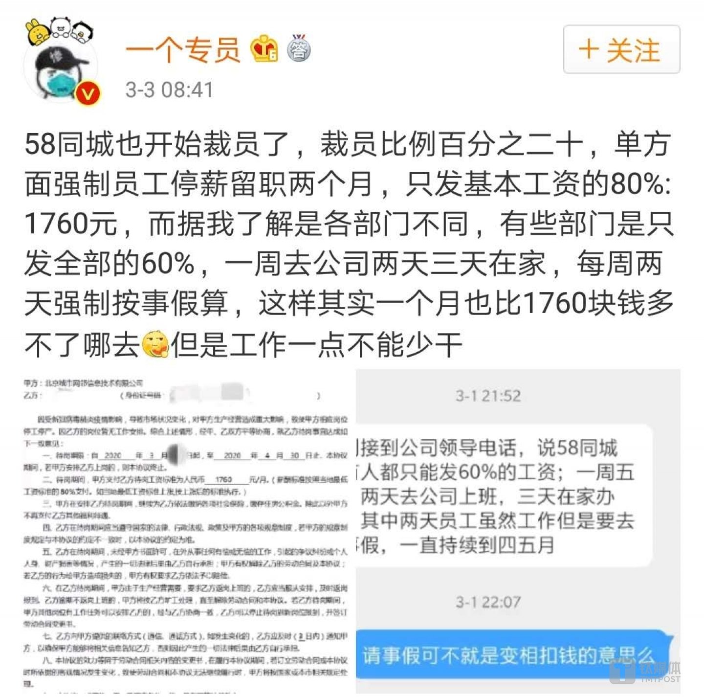 另据名为“一个专员”的微博博主爆料,58同城此次裁员比例为20%,降薪比例各部门不同,有些部门是只发放全部工资的60%,一周五天,两天去公司,三天在家办公,但其中两天要请事假(变相扣工资)。