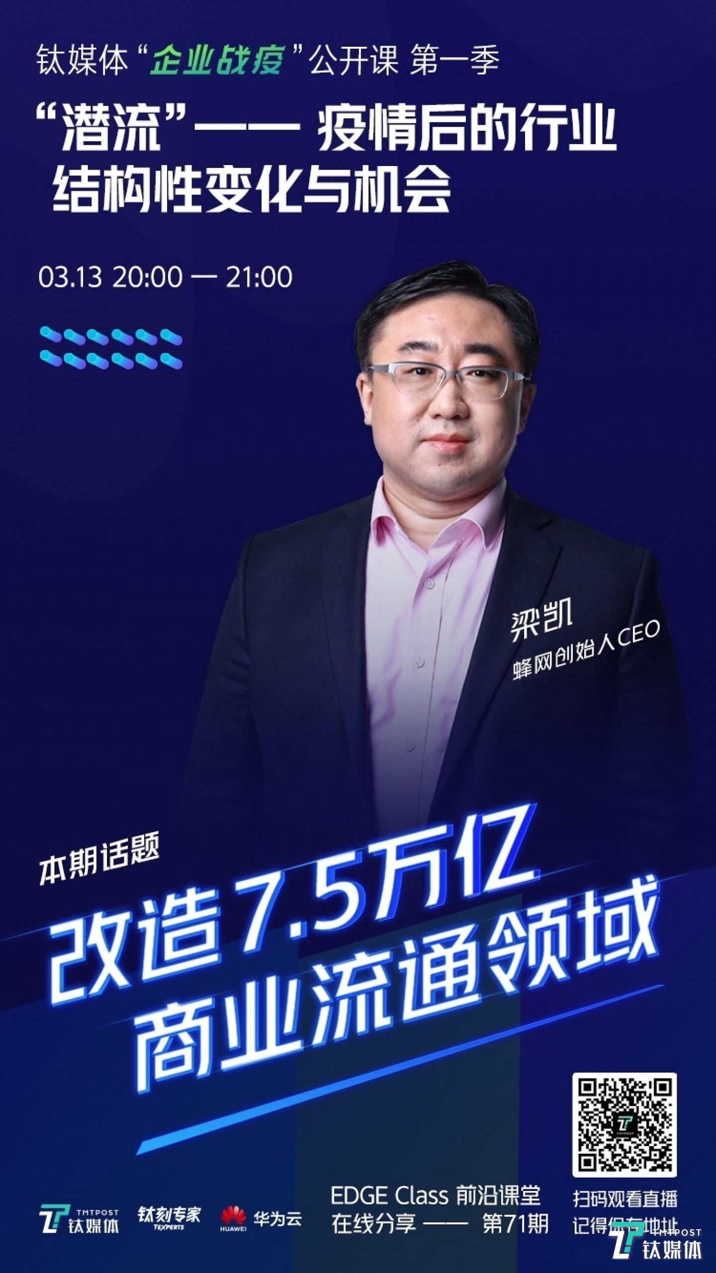 钛媒体“企业战疫”公开课第一季,“潜流”——疫情后的行业结构性变化与机会,蜂网创始人梁凯将围绕:改造7.5万亿,商业流通领域展开分享。