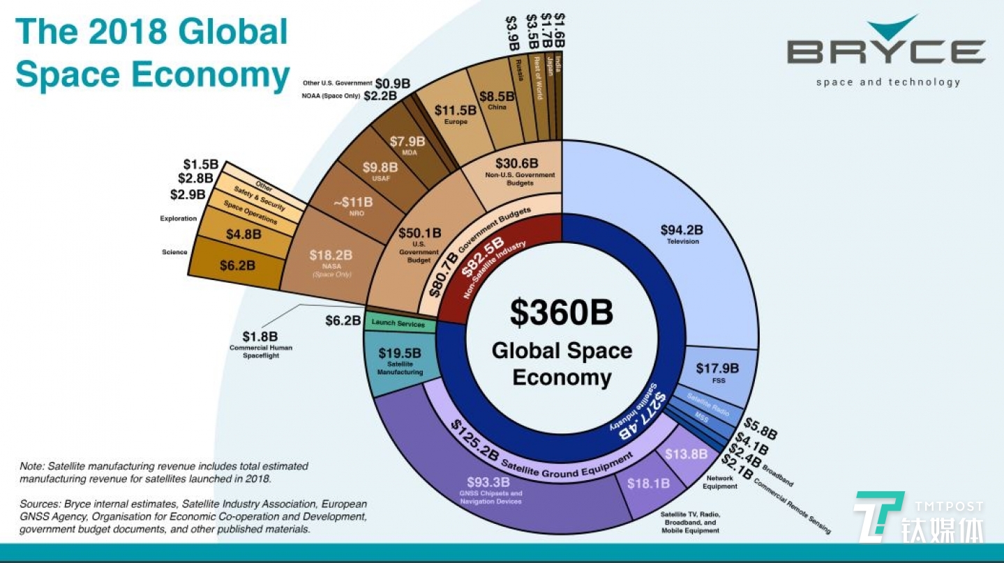 根据市场分析机构Bryce Space and Technology(以下称BST)提供的一项数据报告显示,在新冠疫情大流行之前,全球航天产业进入了发展阶段,其价值约为3600亿美元。其中,2274亿美元属于卫星产业。