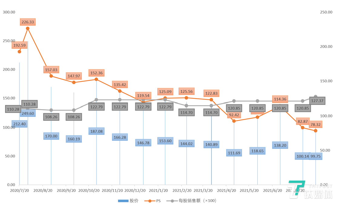 由于公司尚未实现盈利,我们用PS法对公司的股价进行一下分析,公司股价的下降主要是由于市场之前对股价的估值进行的回调,公司上市后的每股销售额并没有呈现出大幅的下降的趋势,保持在一个较为平稳的水平,较刚上市时还提升了15% ,而PS则有大幅下降,显示出公司前期估值较高,上市后的这一年市场在对其高估值进行逐渐消化,所以,公司市值的大幅缩水并不值得惊讶,这是正常现象,前期那么高的估值才值得惊讶。