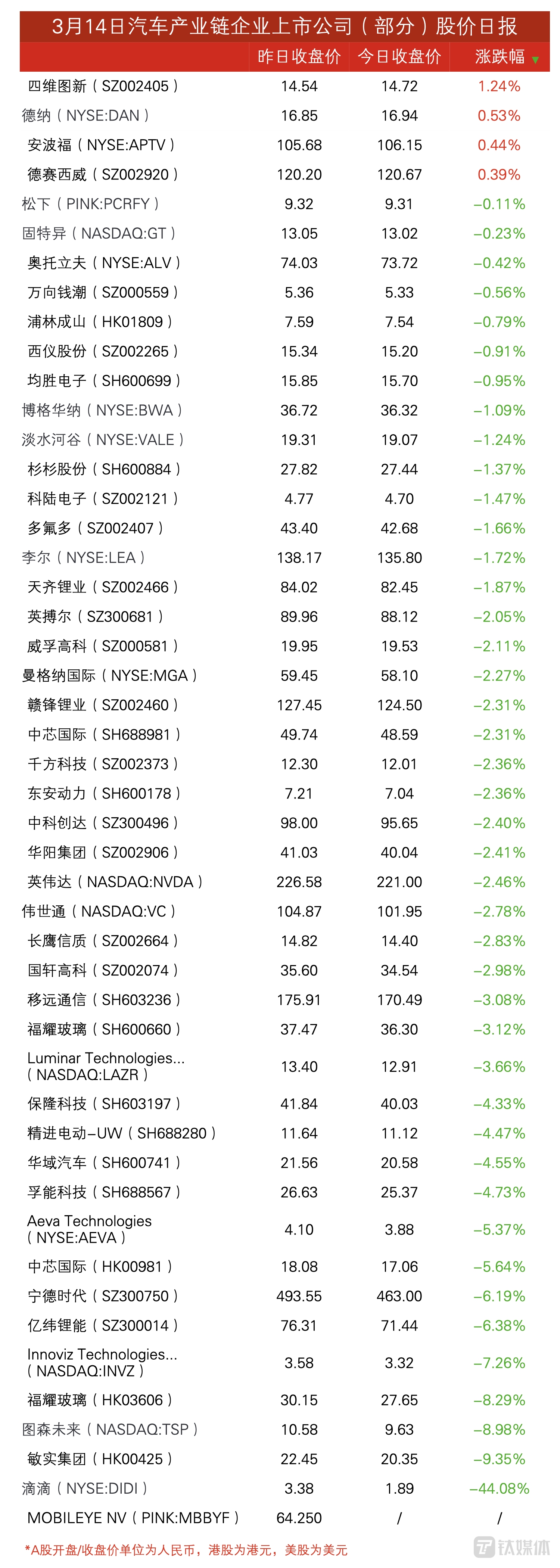 滴滴股价惨遭腰斩 | 3月14日汽车产业链上市公司股价日报