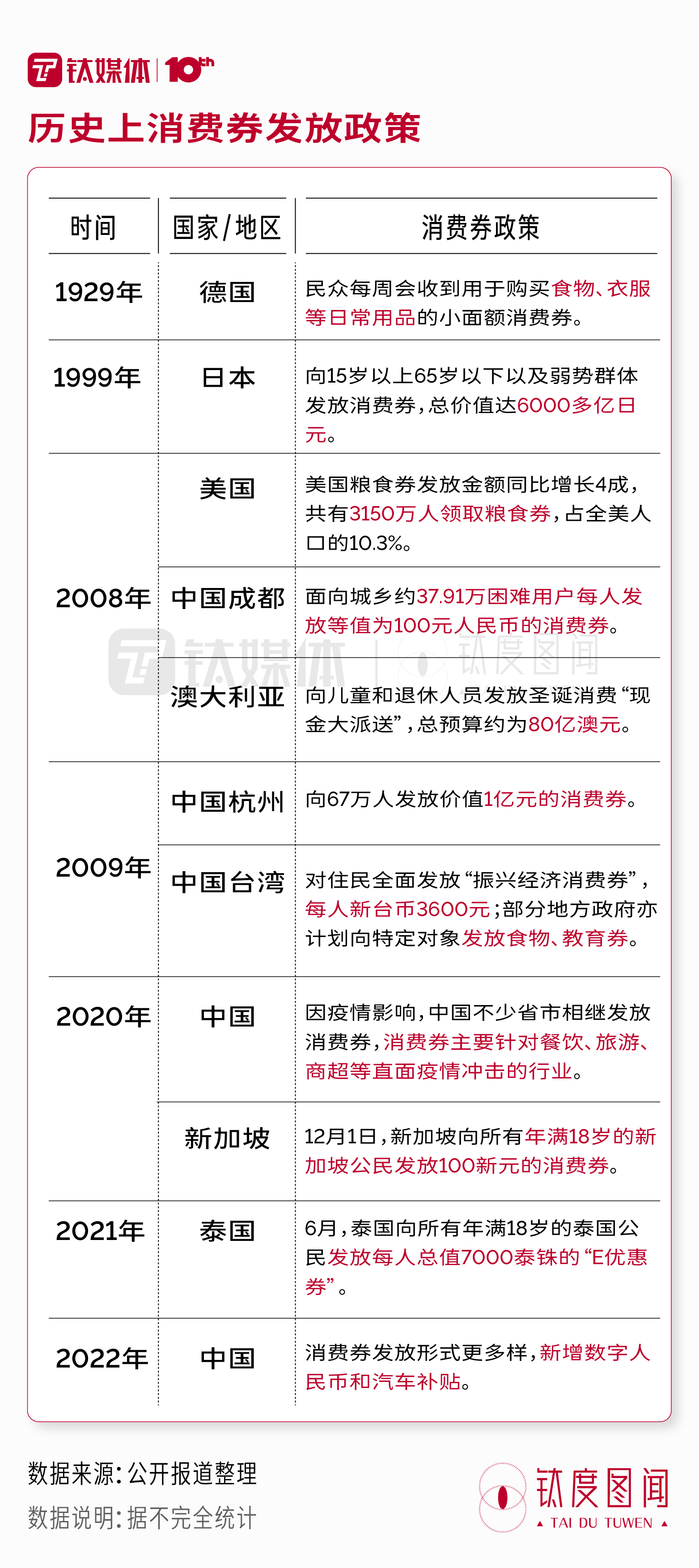 据钛媒体·钛度图闻统计资料显示,1929年-1933年间,为扭转因经济危机导致的低迷的经济趋势,部分国家尝试以“券”的形式来补贴居民的基本生活消费。1999年,日本政府为了刺激消费,向特定人群发放了总价值达6000多亿日元的“地域振兴券”,此次消费券带动了新增消费2025亿日元,在短期内确实对日本消费起到了一定的拉升效果。回溯我国,在2008年金融危机后,中国开始尝试消费券制度。2008年,成都面向困难人群发放消费券。2009年,杭州市曾发放总额达数亿元的消费券。