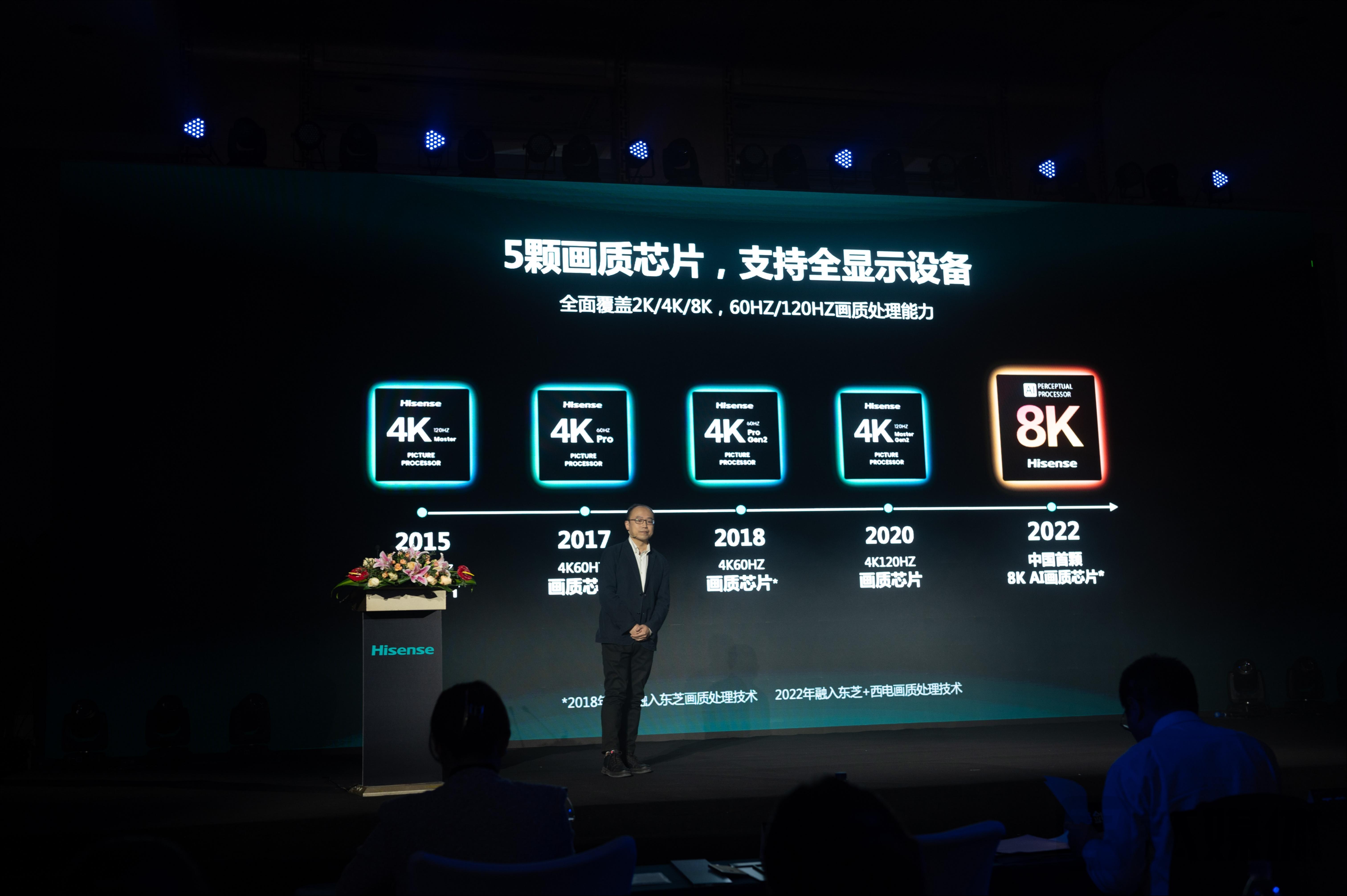 从2015年到2022年,海信陆续发布了5颗画质芯片,其中既涵盖了现如今看来已经成为主流的4K/60Hz、4K/120Hz画质芯片,也包括了填补国内行业空白的8K AI画质芯片。