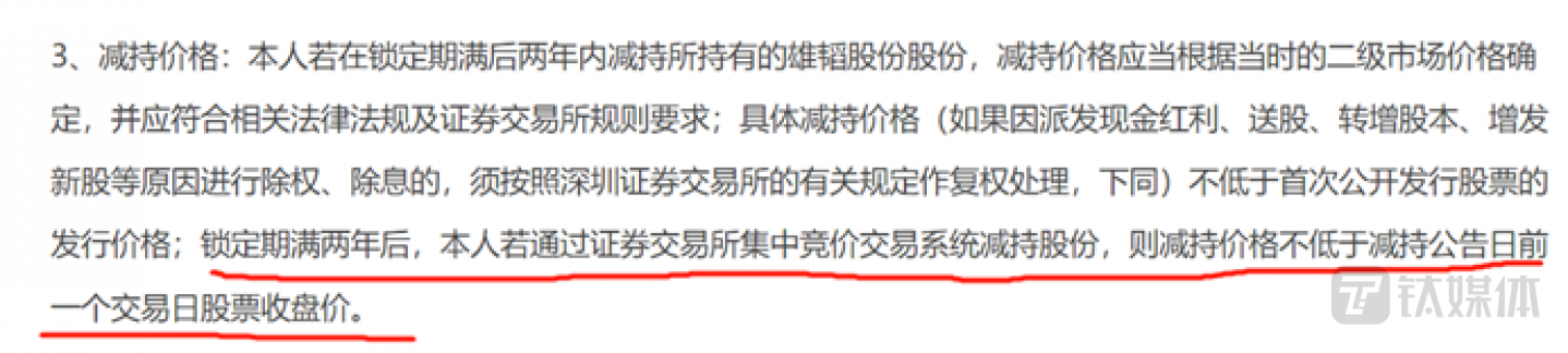 但公告原文的信息其实并不难理解:雄韬股份2014年12月3日IPO上市,张华农的锁定时间为36个月,2017年12月3日锁定期满,到2019年12月2日两年内张华农的减持价格不能低于公司发行价,而2019年12月以后的减持动作就应当不低于公告日前一交易日股票收盘价。