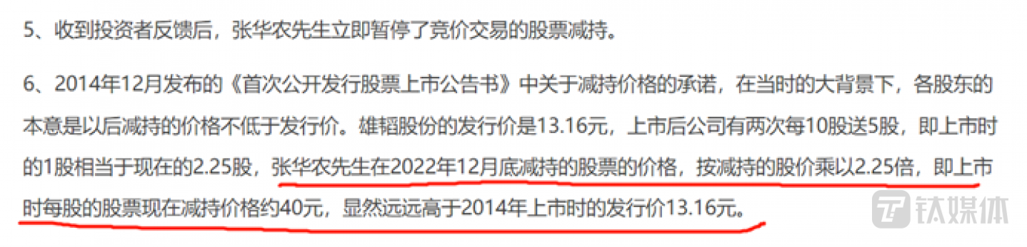 怎么回事?公司辩称,张华农搞错了对2014年12月发布的《首次公开发行股票上市公告书》中关于减持价格承诺的理解。“各股东的本意是以后减持的价格不低于发行价。雄韬股份的发行价是13.16 元,上市后公司有两次每10股送5股,即上市时的1股相当于现在的 2.25 股,张华农先生在2022 年12 月底减持的股票的价格,按减持的股价乘以2.25 倍,即上市时每股的股票现在减持价格约40 元,显然远远高于2014年上市时的发行价 13.16 元。”