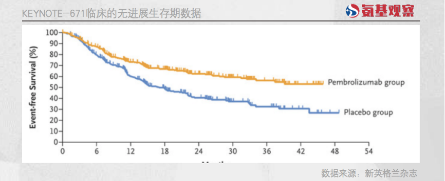 另一方面,K药的临床数据质量也有待商榷。Keynote-671的新数据显示,治疗组患者的中位无进展生存期为34.1个月,对照组为17个月。
