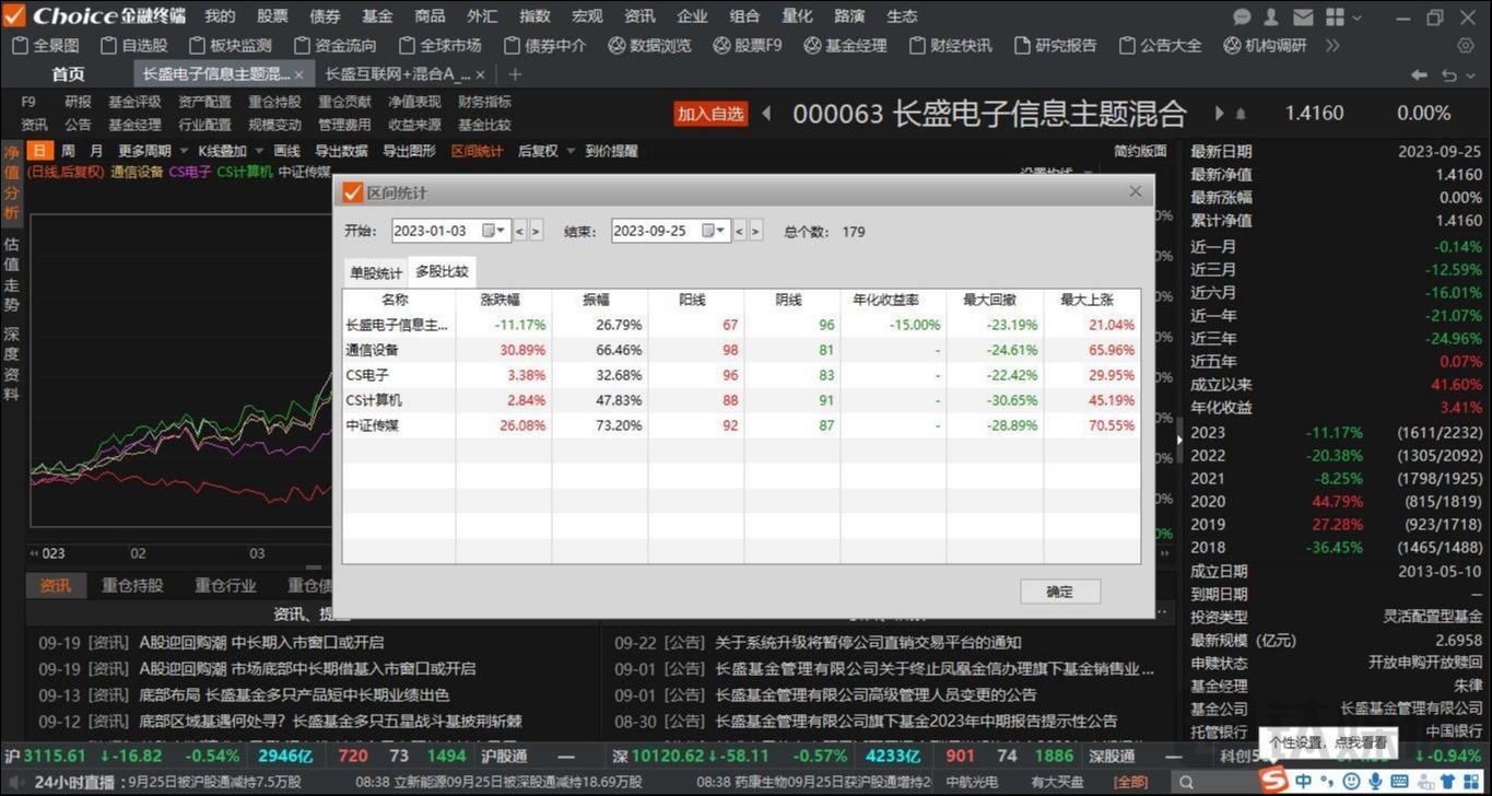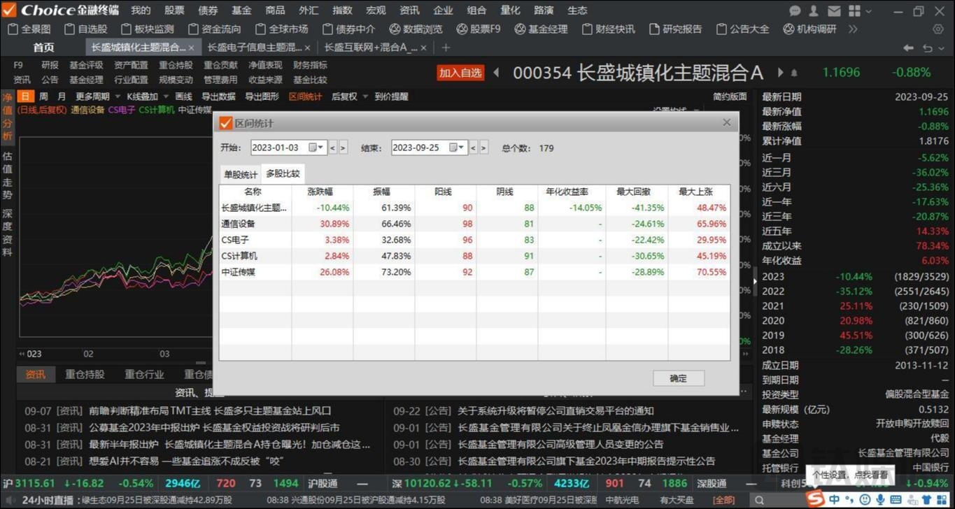 更令人奇怪的一点是,在TMT板块收涨的日子里,长盛电子信息主题混合仍在下跌。Choice终端数据显示,在从2023年1月3日到9月25日的179个交易日中,TMT板块4个一级行业收阳线的交易日数量在88到98个之间,而收阴线的交易日数量在81到91个之间。但是长盛电子信息主题混合收阳线的交易日数量仅67个,远远少于TMT板块;收阴线的交易日数量则多达96个,又多于TMT板块。为什么会是这样呢?