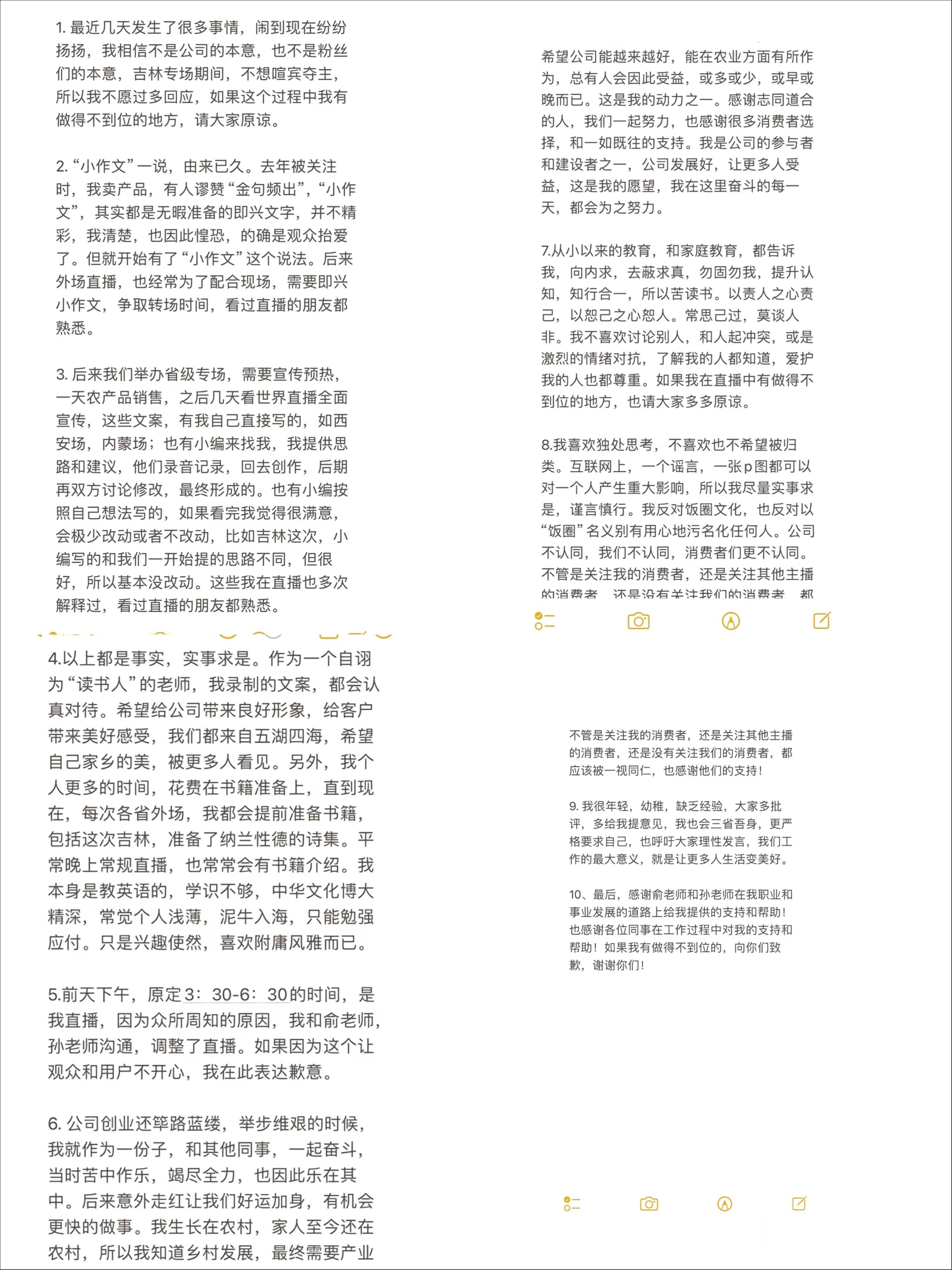 13日凌晨,董宇辉也发布长文回应,吉林专场期间,不想喧宾夺主,看世界直播全宣传文案是自己写的,同时提到小作文创作模式主要有几种,一是本人创作,如西安场,内蒙场。二是自己提供思路和建议,小编回去创作,后期双方修改。三是小编按照自己想法创作,自己极少改动或不改动。董宇辉还提到“常思己过,莫谈人非,我不喜欢讨论别人和人起冲突,或是激烈的情绪对抗,最后董宇辉也重点强调反对饭圈文化,反对以饭圈名义别有用心地污名化任何人。
