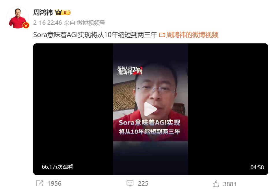 360创始人周鸿祎第一时间发博表示,Sora意味着AGI实现将从10年缩短到两三年。他谈到Sora通过把大语言模型和扩散模型结合,实现了对现实世界的理解和对世界的模拟两层能力。一旦AI接上摄像头,把所有电影、YouTube和TikTok上的视频看一遍,对世界的理解将远超过文字学习。