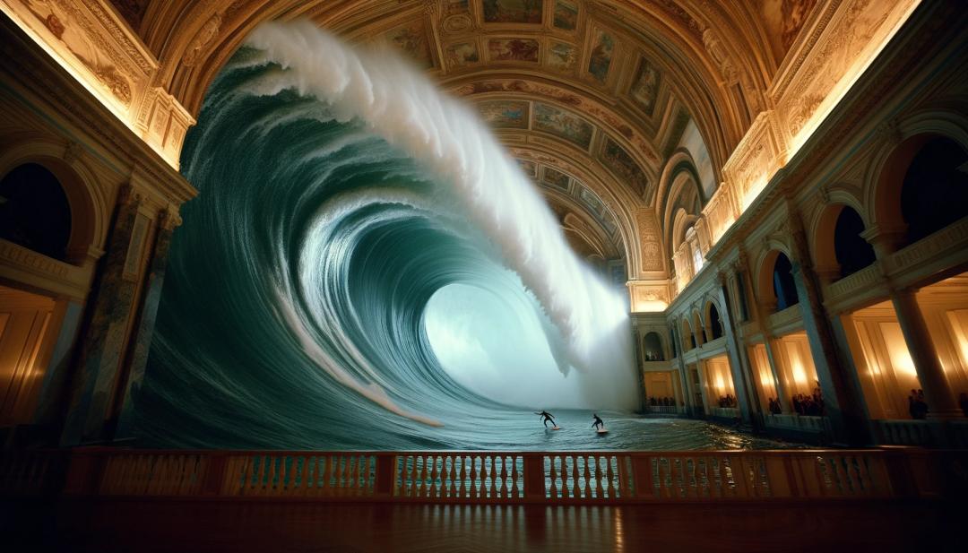 提示词:在一个华丽的历史大厅里,一个巨大的潮汐达到顶峰并开始崩溃。两名冲浪者抓住时机,熟练地驾驭海浪。