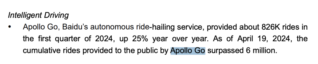 在前不久公布的2024年百度第一季度财务数据中,旗下萝卜快跑平台累计订单已经超过了600万单,本季度订单量82.6万单,同比增长了25%。