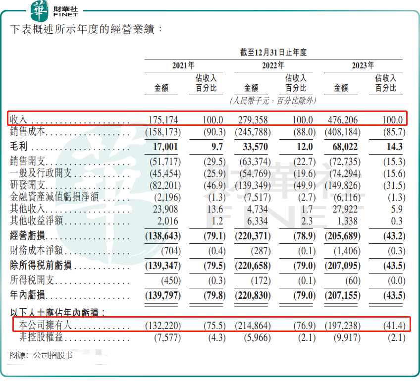 招股书显示,2021年至2023年,佑驾创新收入分别为1.75亿元、2.79亿元及4.76亿元,增长较为迅猛,但收入规模不大;公司拥有人应占年内亏损分别为1.32亿元、2.15亿元及1.97亿元,三年累计亏损超5.4亿元。