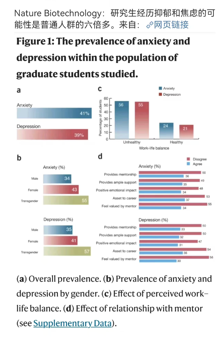 根据《2023年度中国精神心理健康》蓝皮书显示,目前我国患抑郁症人数大约有9500万人,仅有36%的国民认为自己心理健康良好。《Nature Biotechnology》曾刊登一篇论文,实验数据显示:研究生经历抑郁和焦虑的可能性是普通人群的六倍多。