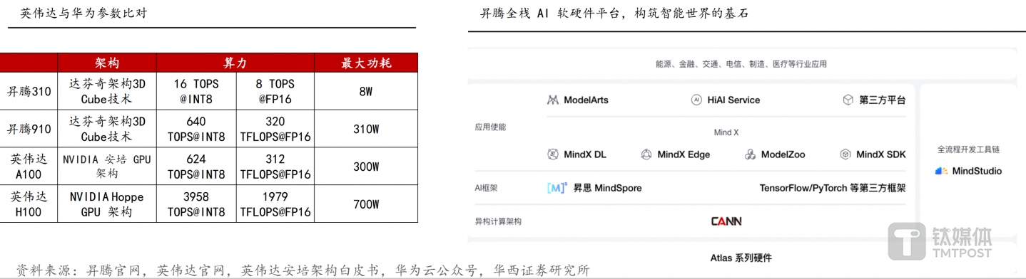 华西证券分析指出,昇腾910和昇腾310两款AI芯片均使用华为的达芬奇架构,参数方面,昇腾910芯片单卡算力可与英伟达A100相媲美,相关配套供应链国产化大势所趋。