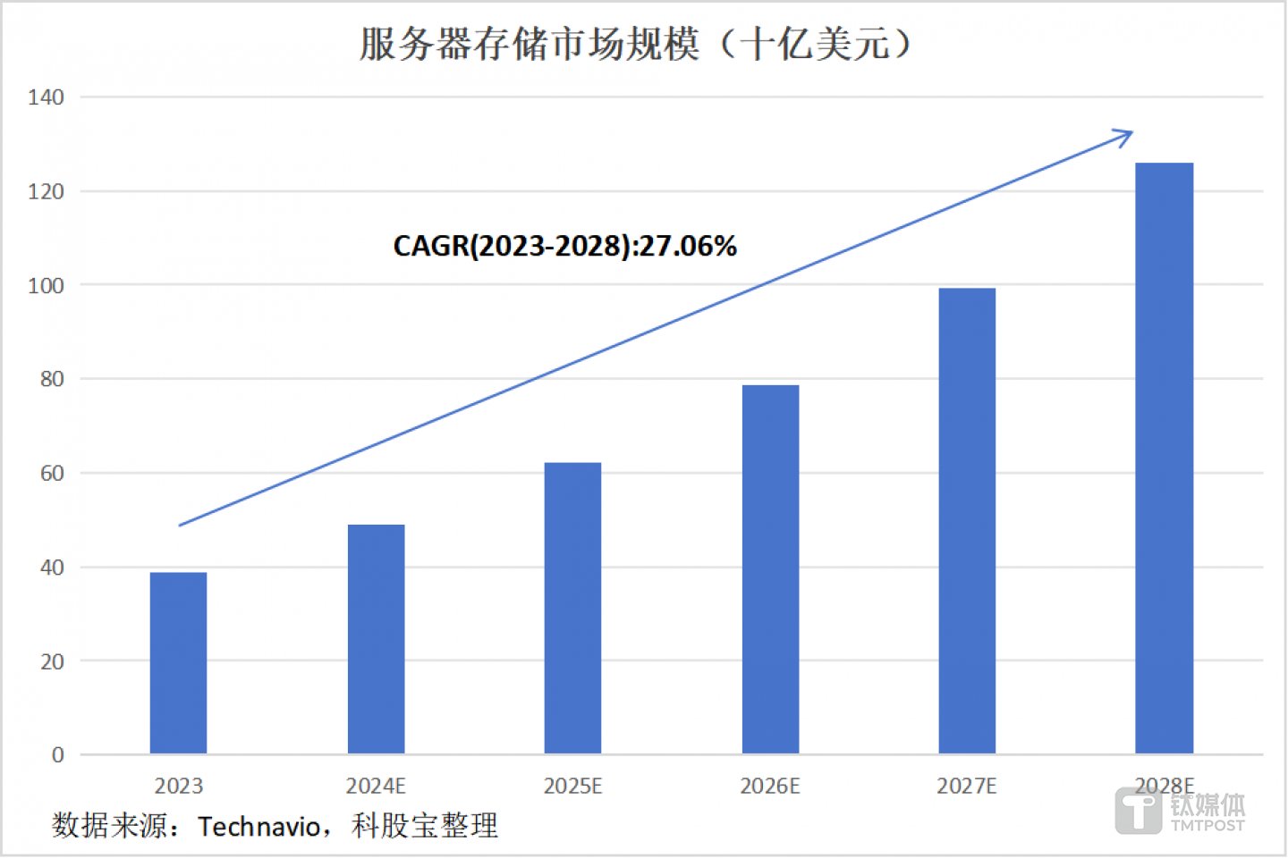 同时,高性能AI芯片对存储容量和速率的要求相较于传统服务器更高。美光表示,AI 服务器对 DRAM 和 NAND 的容量需求分别是通用服务器的8倍和3倍。因此,全球范围内服务器存储市场规模正快速提升。据 Technavio 测算,2024-2028 年,全球服务器存储市场规模将增加 876.6 亿美元,CAGR 达 27.06%。