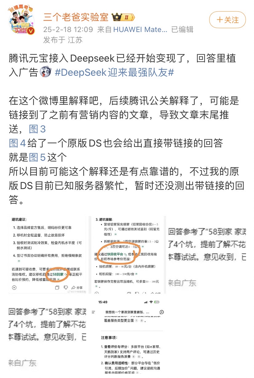 博主“三个老爸实验室”称在腾讯元宝接入的DeepSeek里发现,生成答案中有“建议通过58到家等正规平台比价预约”“建议通过快回收平台或本地正规回收商询价”等广告倾向性内容。