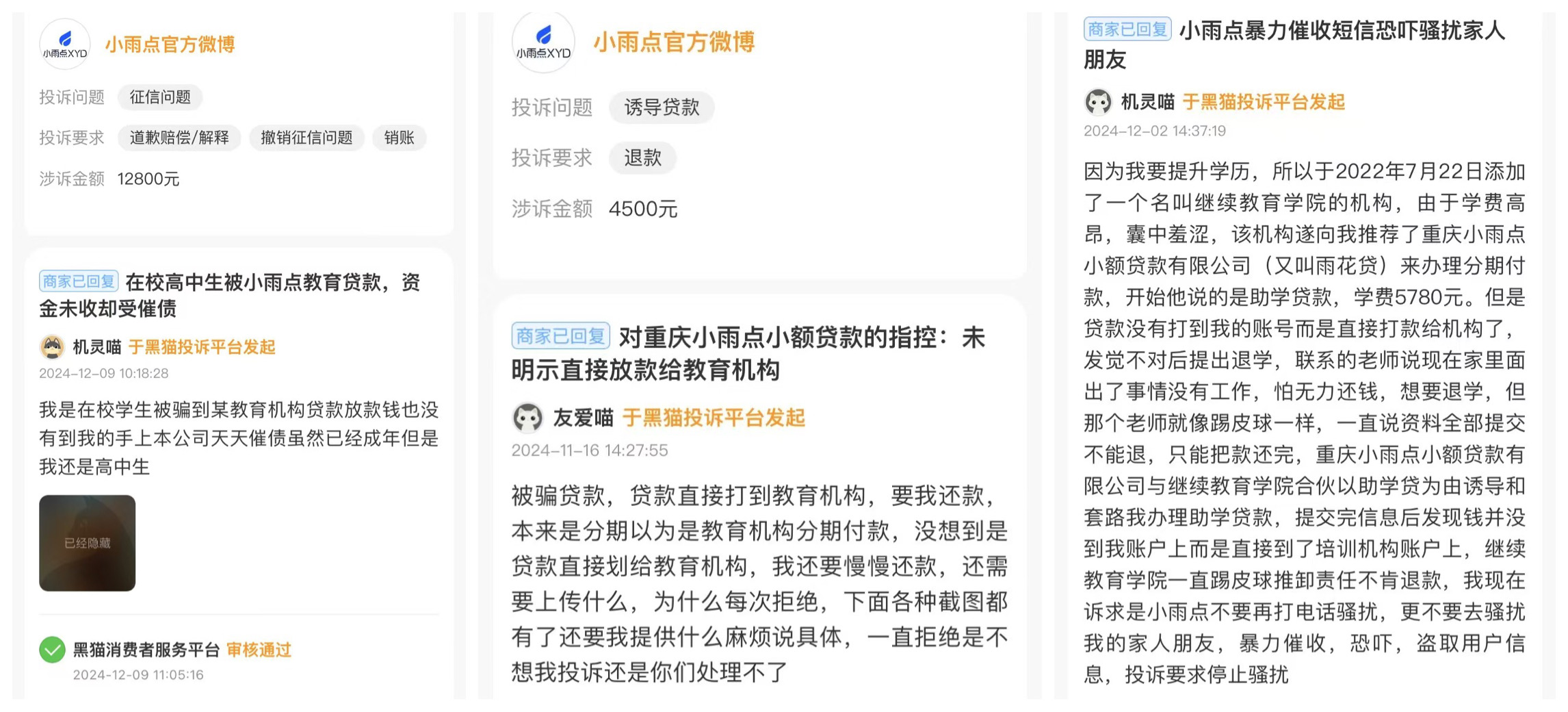这些投诉案例显示,消费者在追求教育提升或求职培训的过程中,被培训机构与小雨点小贷的合作模式所误导,陷入了未充分知情且可能无力承担贷款的困境。