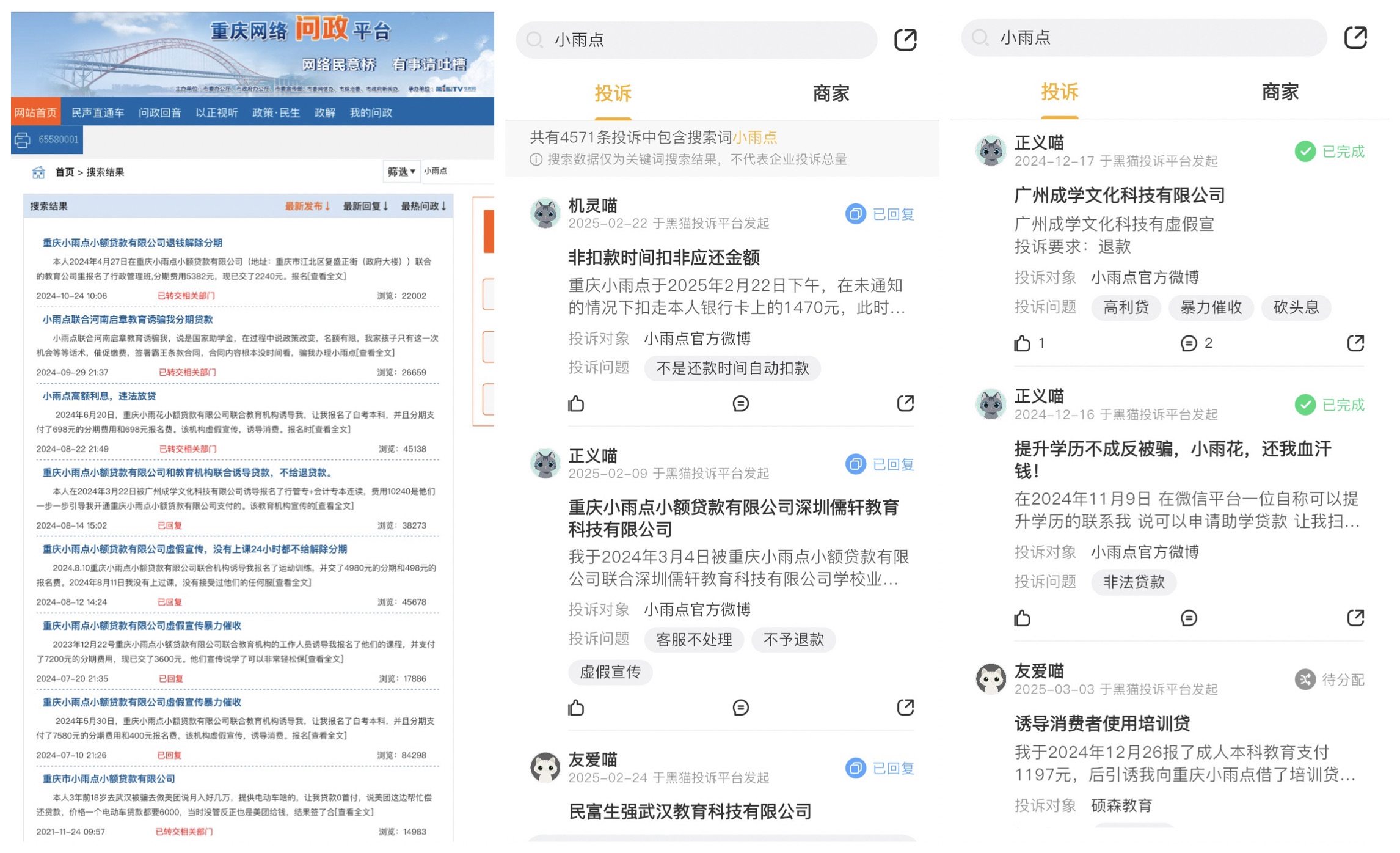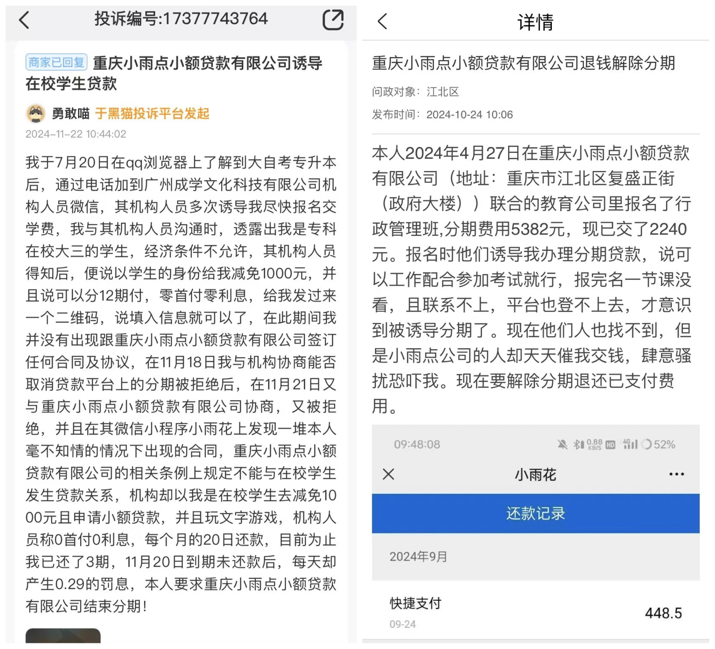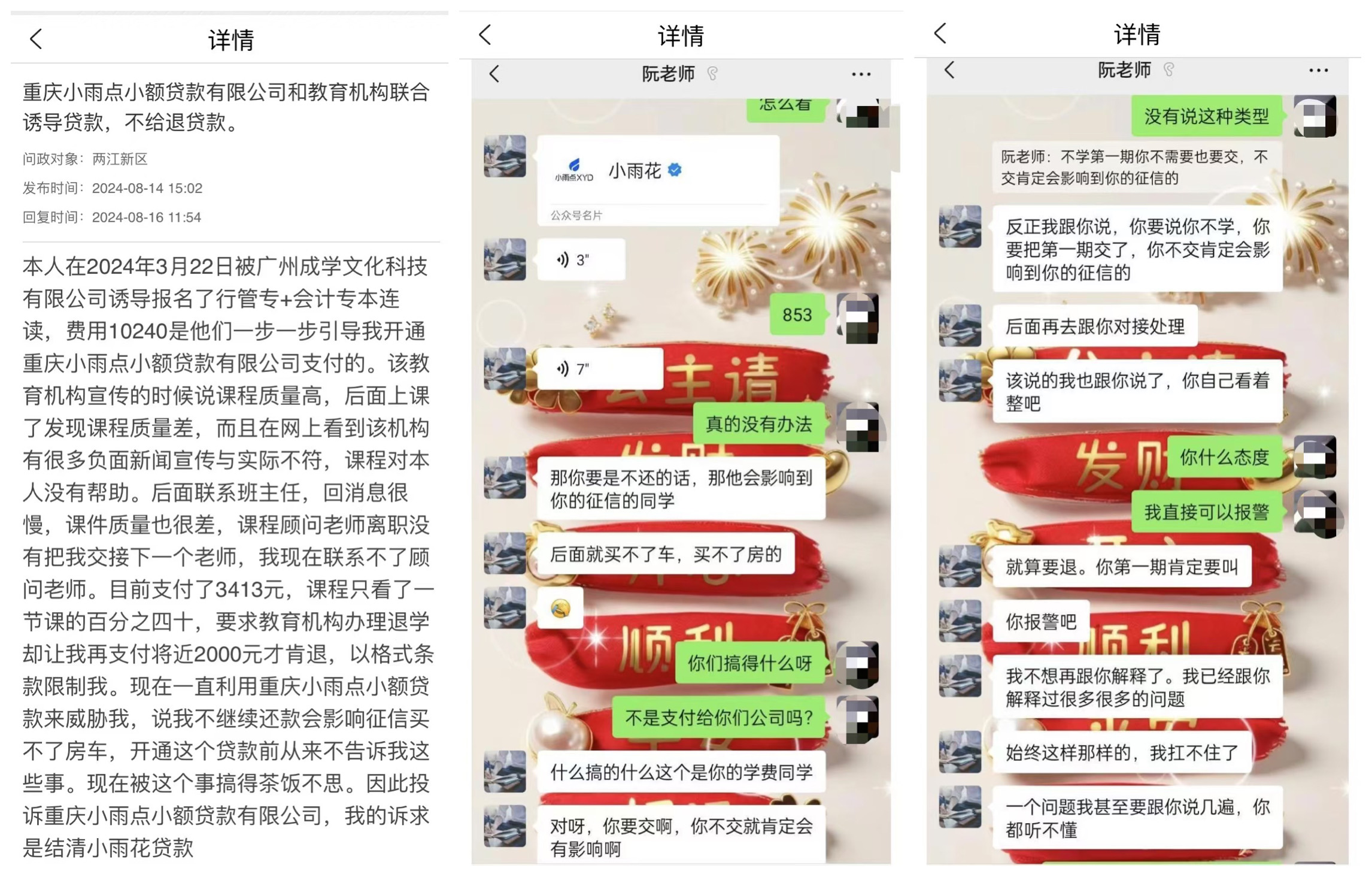 还有消费者称,2024年4月27日在小雨点小贷联合的教育公司报名行政管理班,费用5382元,已交2240元。报名时被诱导办理分期贷款,报完名后发现课程无法观看、平台无法登录,联系不上相关人员,“但是小雨点公司的人却天天催我交钱,肆意骚扰恐吓我”。