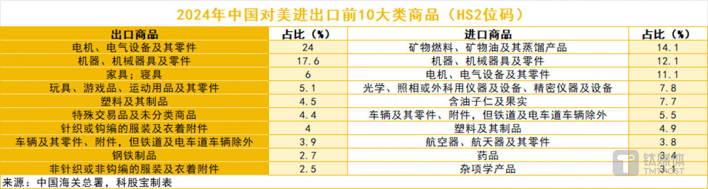 中美双边贸易互补性强。根据中国海关数据,2024年中国向美国出口前五大类商品为电机电气设备及其零附件、机械器具及零件、家具、玩具和塑料制品等,合计占比为57.2%。中国从美国进口前五大类商品为矿物燃料、机械器具及零件、电机电气设备及其零附件、光学仪器和大豆等含油子仁,合计占比为52.8%。