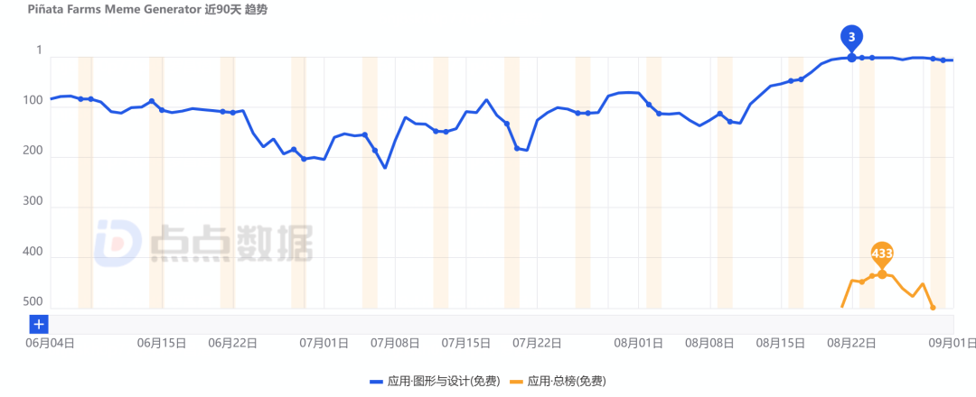 八月底,一款名为《Piñata Farms Meme Generator》的AI视频制作应用快速在美国地区走红,其在美国地区App Store图形与设计类别免费榜的排名也迅速由月初的百名开外跃居至第三位。