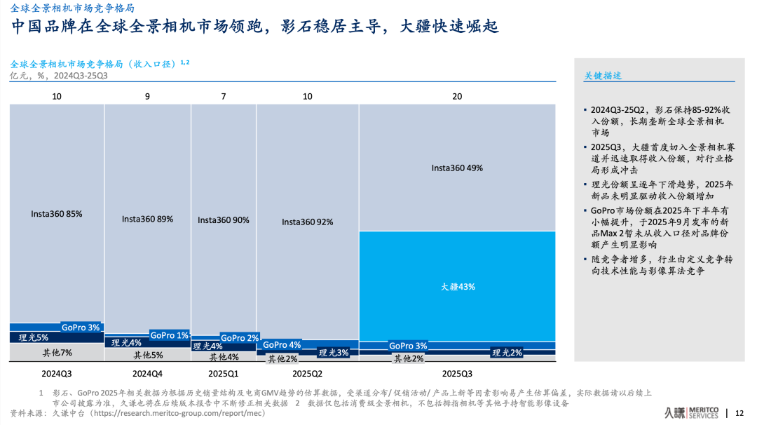 第三方机构久谦咨询发布报告称,“大疆在2025年Q3(上市不到三个月),就拿下了全球全景相机市场43%的份额。在运动相机领域全球收入份额也稳步攀升至66%,位于行业全球第一。”而几天后,沙利文的报告却呈现了另一番景象——影石全景相机占行业75%,大疆仅有17.1%。