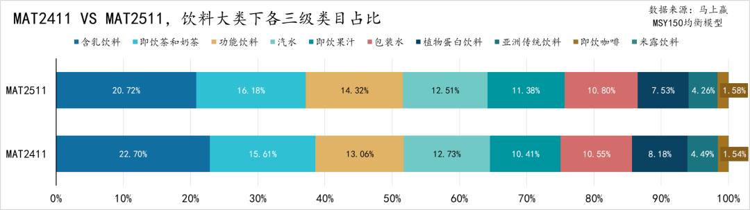 首先来看各三级类目在MAT2511、MAT2411两个时间段的占比,含乳饮料是饮料大类中唯一占比超过20%的类目,即饮茶和奶茶、功能饮料、汽水、即饮果汁和包装水的占比均超10%,植物蛋白饮料占比约8%、亚洲传统饮料(凉茶、酸梅汤、植物饮料等)占比约4.5%,即饮咖啡占比约1.5%,米露饮料占比不足0.1%。