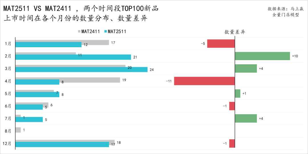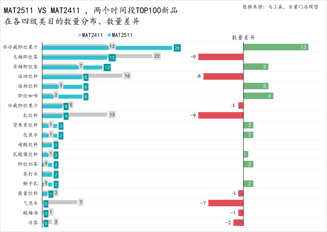 从MAT2511、MAT2411两个时间段TOP100新品在各四级类目中的分布数量和两个时间段的差异来看: