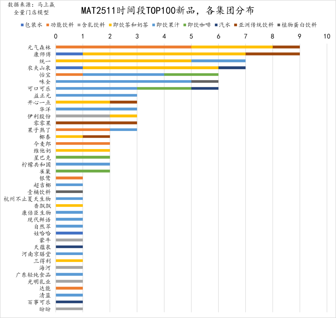 在MAT2511的饮料类目TOP100新品中,还有高达20个集团有1款新品上榜,其中既有老牌饮料集团,也有许多新鲜名字,值得进一步观察其未来表现。