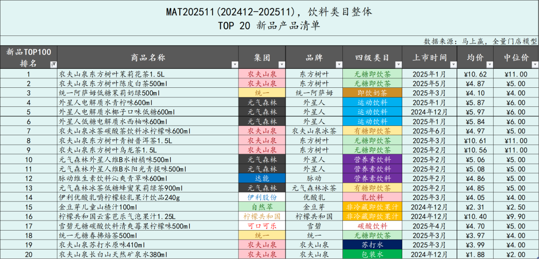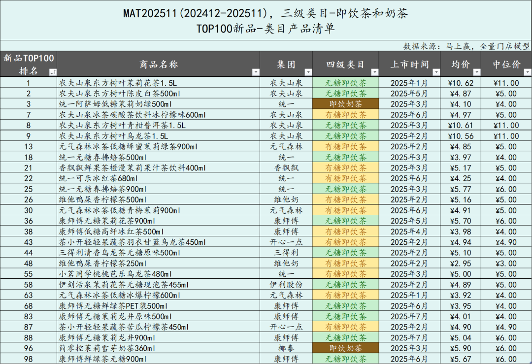 2025年已经接近尾声,未来两周马上赢情报站也将开启“年终盘点模式”。与往年类似,今年的年终盘点系列依然从饮料新品开始,通过回顾2024年12月-2025年11月饮料市场的TOP100单品,以及与上一年同一时间段的对比,来观察在过去一年,饮料市场有什么新的趋势与走向。在下一周,我们将对饮料各类目中的TOP集团及其份额变动进行盘点,敬请关注!
