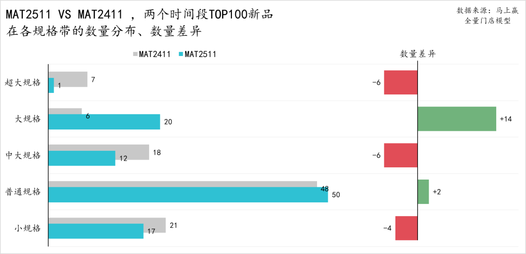 从规格带分布及同比变化来看,普通规格的产品进入TOP100的数量相较MAT2411略有上升,且占比50%,仍然为饮料类目的主流规格,而其前后的小规格、中大规格的TOP100新品数量均出现了一定程度的缩减。