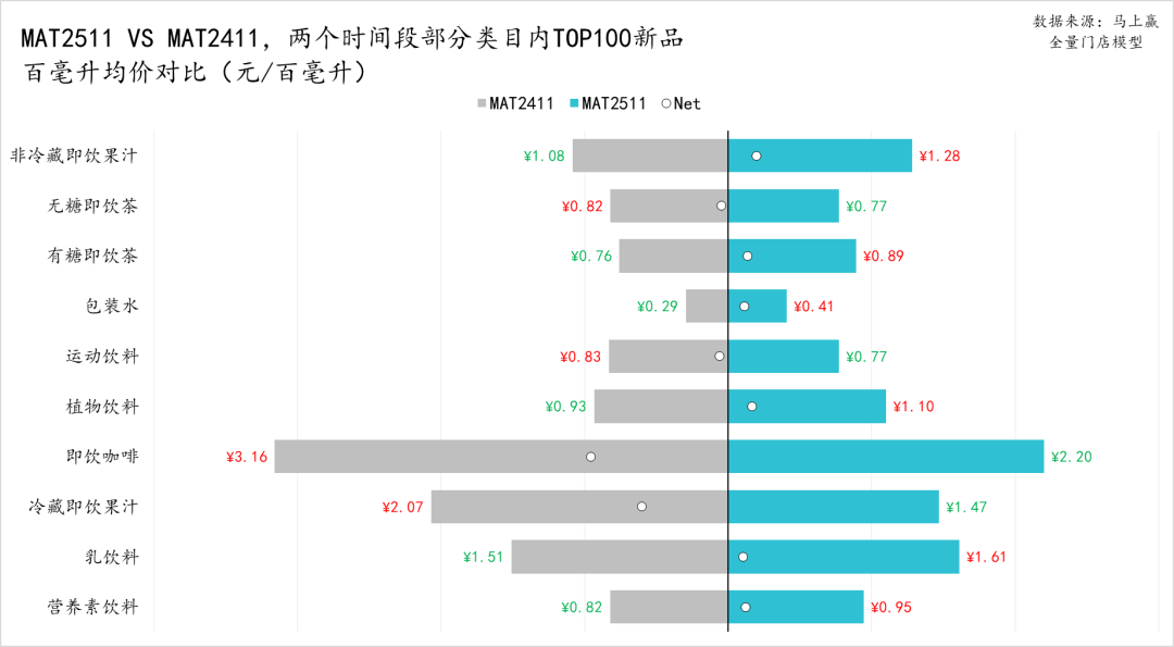 整体来看,MAT2511的TOP新品百毫升均价水平与MAT2411各有交互,其中非冷藏即饮果汁、有糖即饮茶、包装水、植物饮料、乳饮料、营养素饮料几个类目在MAT2511的百毫升均价更高;无糖即饮茶、运动饮料、即饮咖啡、即饮果汁在MAT2511的百毫升均价则要低于MAT2411时间段,尤其是即饮咖啡、冷藏即饮果汁两个类目,呈现出了较大幅度的下滑,但也与其进入TOP新品的商品数量较少、样本较孤立且波动性较大有一定关系。