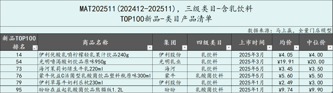 从含乳饮料类目中TOP100新品的市场表现来看,相比MAT2411,MAT2511时间段的新品在类目内的成长明显更差,在大多数月份,MAT2511的TOP100新品的市场份额不足MAT2411的三分之一,或可说明过去一年,类目新品表现、成长性相比之前更差。