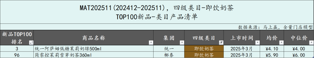 其中,即饮奶茶类目共2款产品,一款为统一的阿萨姆奶茶茉莉奶绿口味低糖版,在整个TOP100新品中排名第三。另一款产品则来自椰泰。