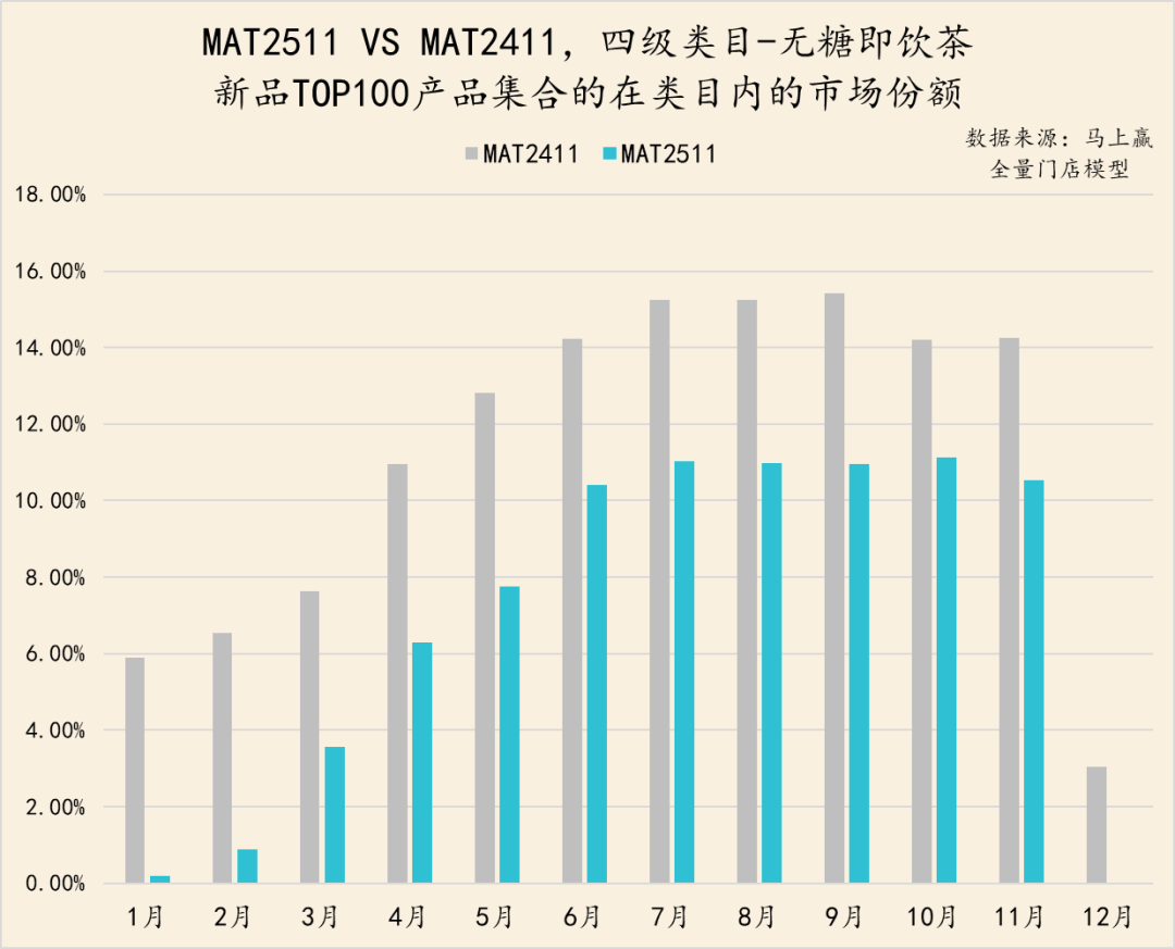相比来说,有糖即饮茶今年TOP新品的市场份额表现要好于无糖即饮茶的表现,但依然不及MAT2411 TOP新品在当年的市场份额表现。