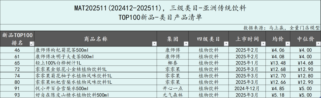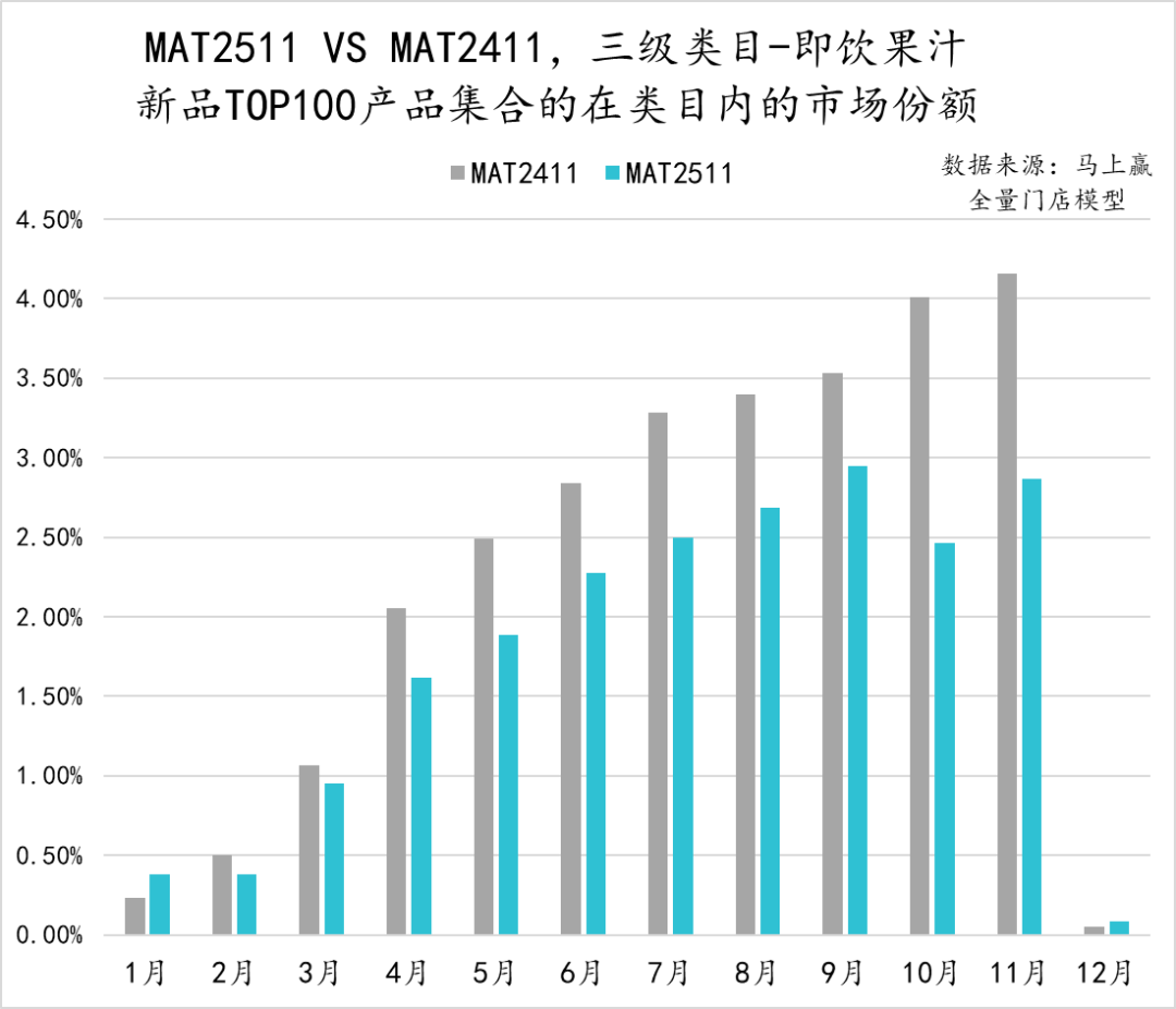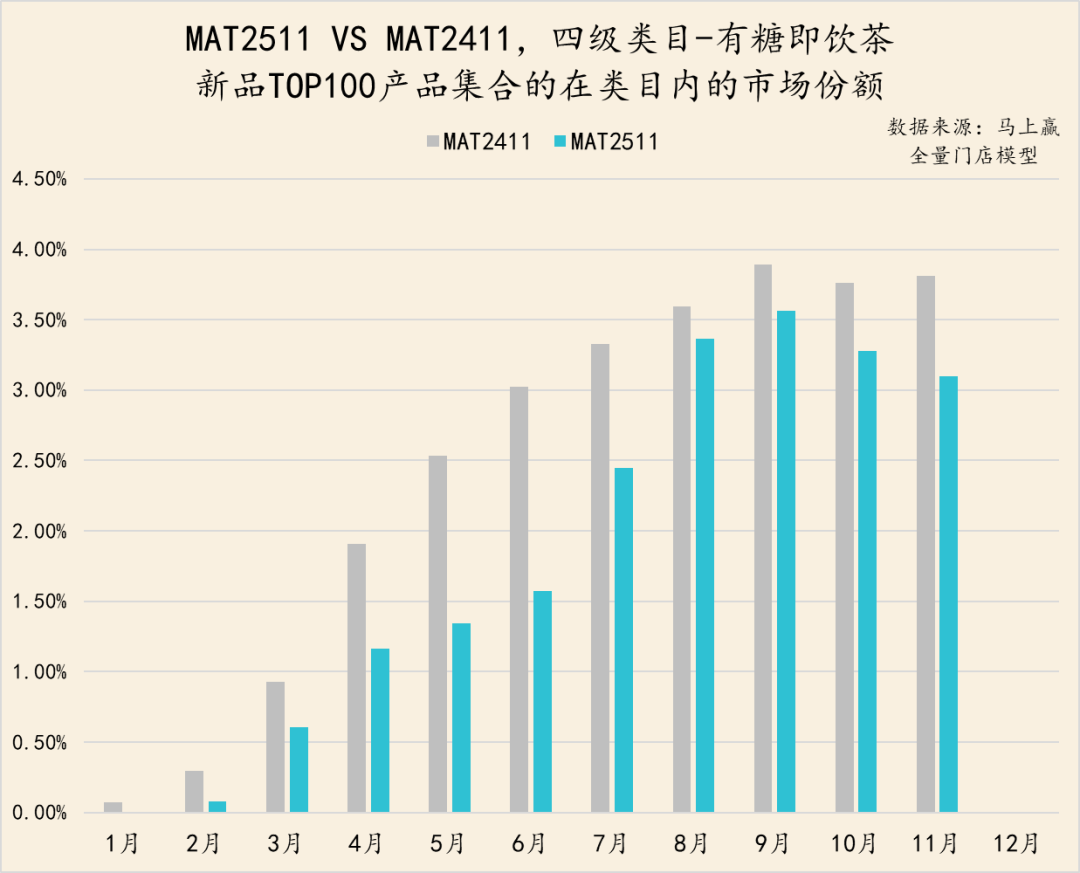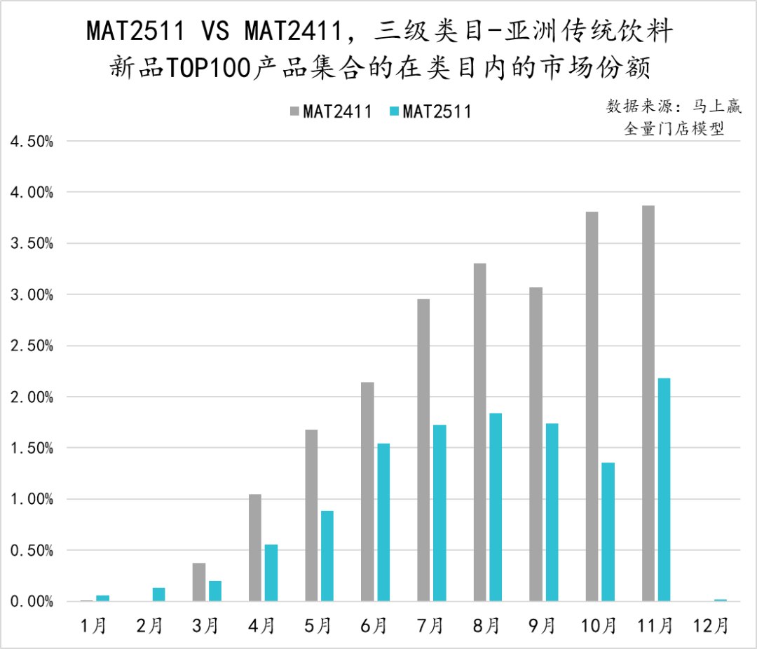 从亚洲传统饮料类目中,TOP100新品的市场表现来看,MAT2511的TOP新品集合的市场份额表现明显弱于MAT2411的TOP新品表现,除11月外其他月份均未超过2%。