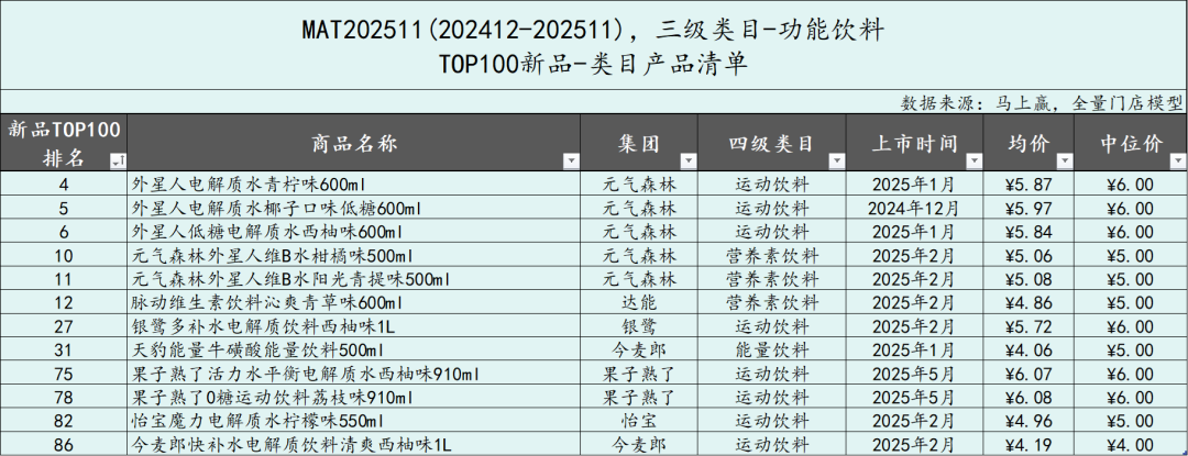 功能饮料类目MAT2511共有12款新品上榜,规格从500ml到1000ml不等,价格从4元到6元不等。其中元气森林包揽了类目TOP新品前五名,果子熟了、今麦郎也各有2款产品上榜,达能、银鹭和怡宝也各有1款产品进入TOP100新品之列。