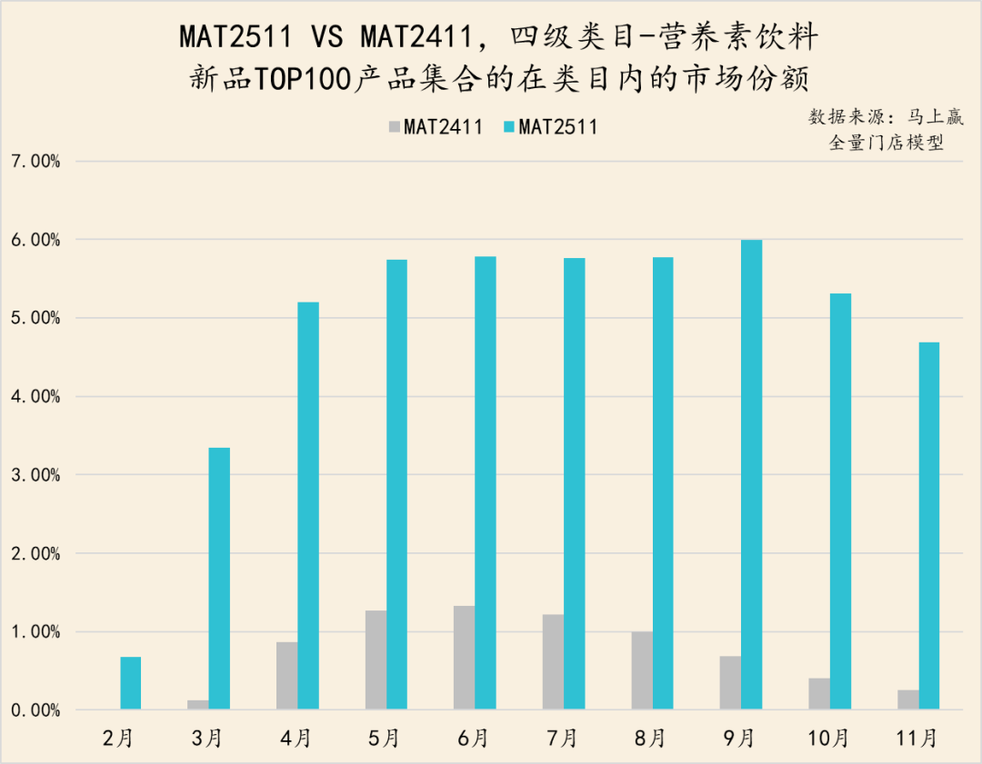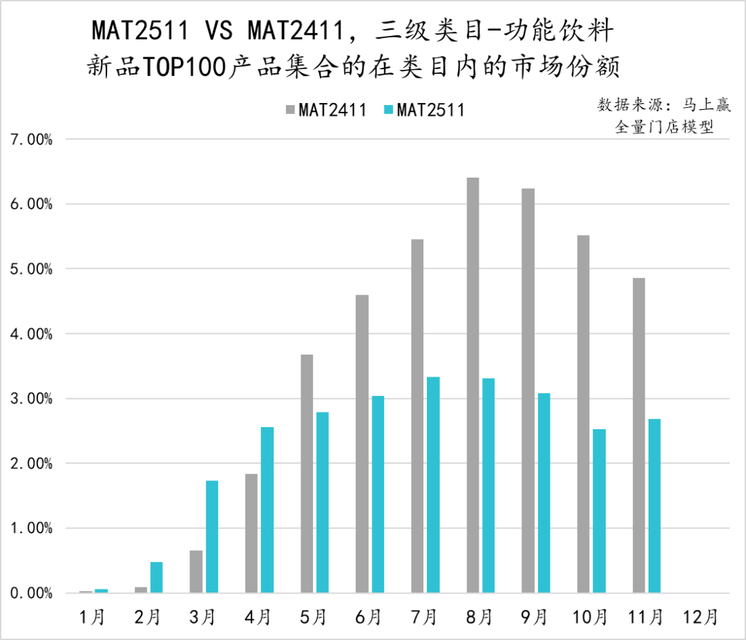 从功能饮料类目内TOP新品集合的各月市场份额来看,MAT2511相比MAT2411市场份额出现了一定程度的萎缩。但在2025年11月,MAT2511的TOP新品份额有一定的增长趋势。