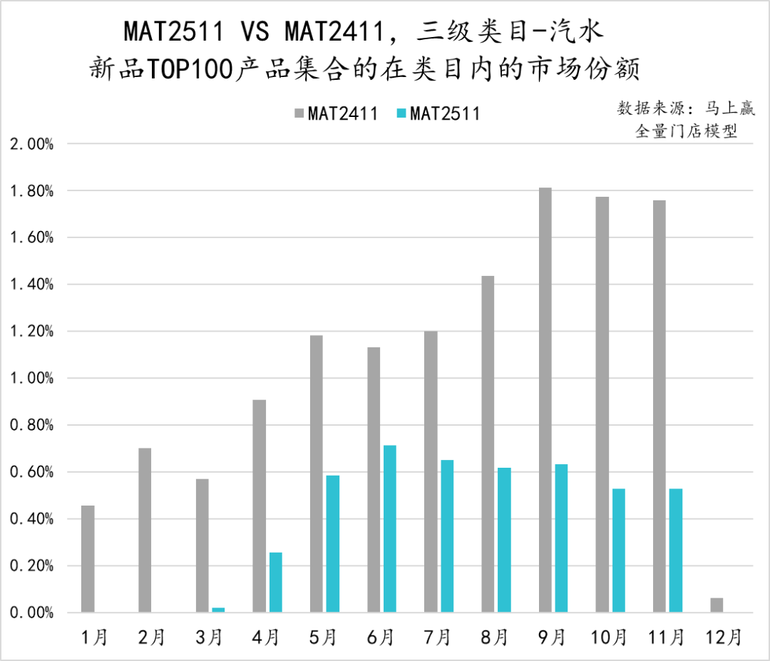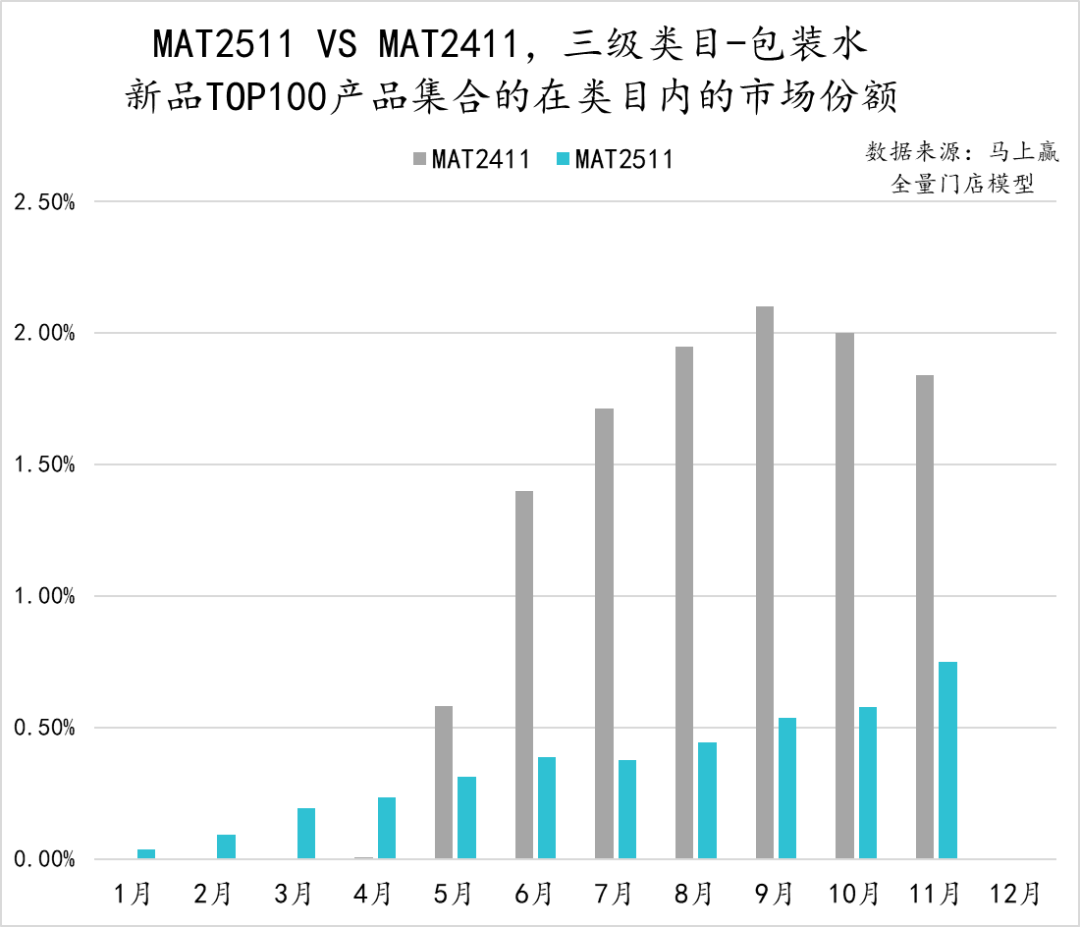 从包装水类目内TOP100新品的各月市场份额来看,MAT2511与MAT2411相比明显表现更弱,或许也与去年的TOP新品中有农夫山泉的“绿水”有关。不同于MAT2411的市场份额快速攀升,MAT2511市场份额始终未超过1%,旺季表现平平。