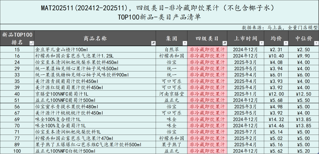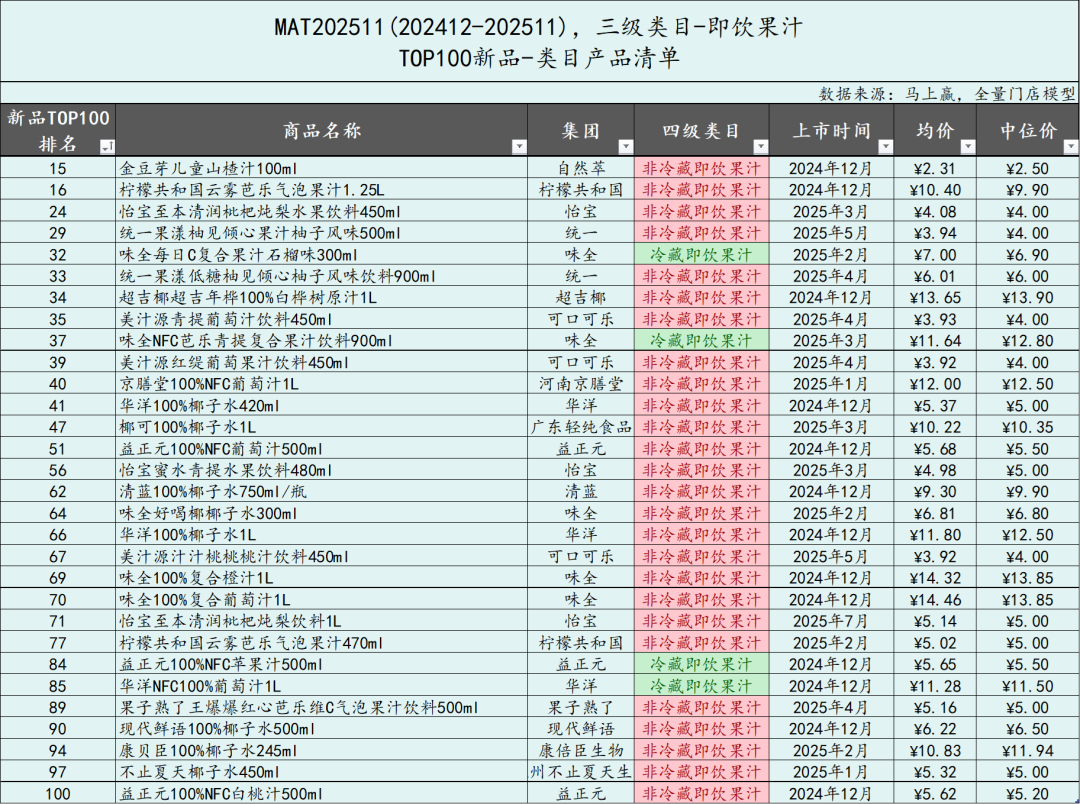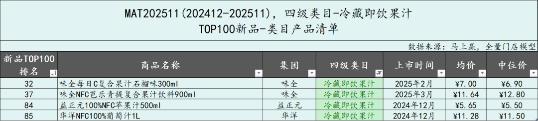 即饮果汁类目是MAT2511时间段中,TOP新品最多的类目,合计达到了30款,其中冷藏即饮果汁4款,非冷藏即饮果汁26款,我们分开来看。