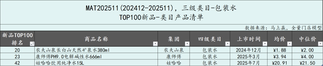 包装水类目共有3款新品上榜MAT2511新品TOP100,农夫山泉、康师傅和娃哈哈各有一款产品上榜,规格从380ml到15L,跨度非常之大。