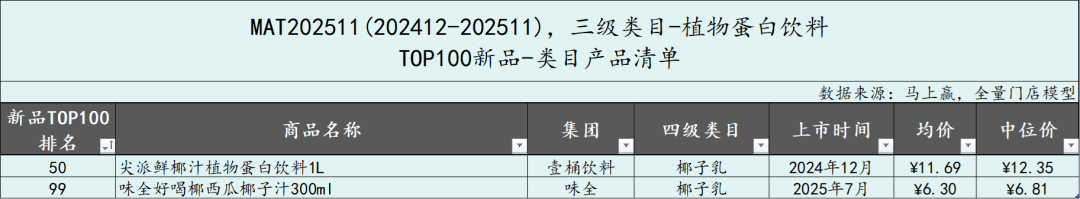 植物蛋白饮料类目仅有2款产品进入新品TOP100,分别来自壹桶饮料和味全,两款产品均为椰子乳,排名均在50名及以后。