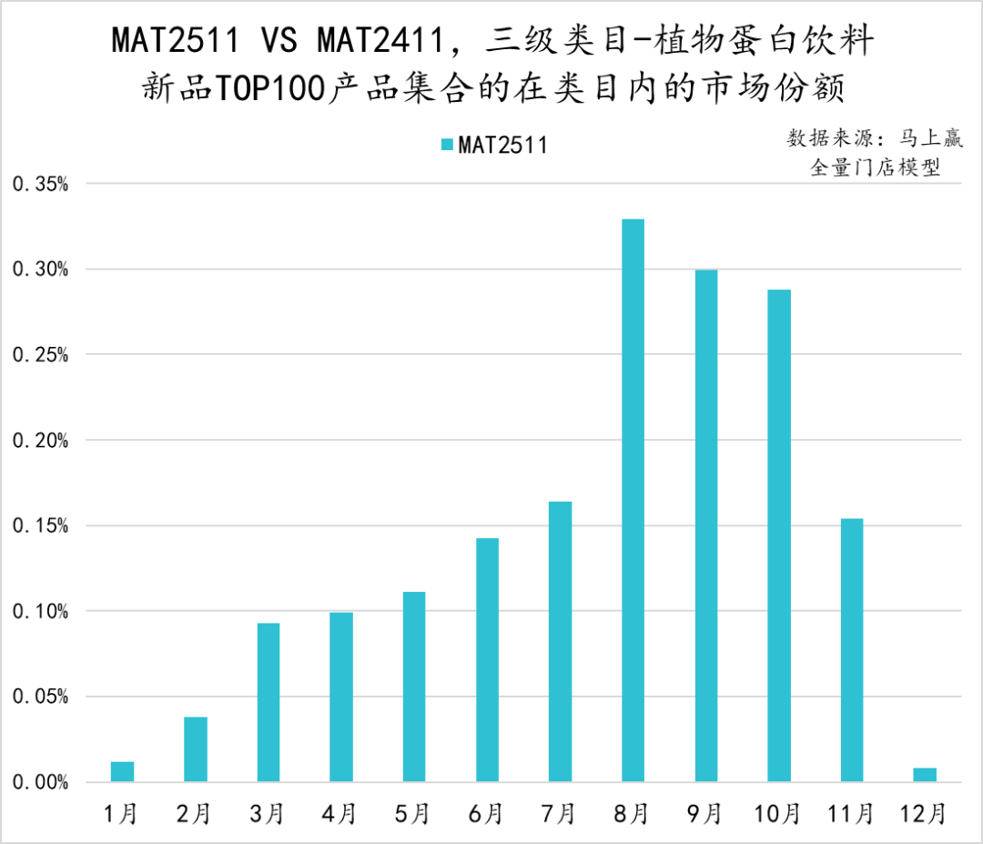 相比MAT2411,MAT2511植物蛋白饮料在TOP100新品中取得了0的突破。由于两款新品上市时间分别为2024年12月和2025年7月,因此在8月产品集合迎来了市场份额峰值,但整体市场份额依然较低不足0.35%,且在随后的9-11月呈现明显的下滑。