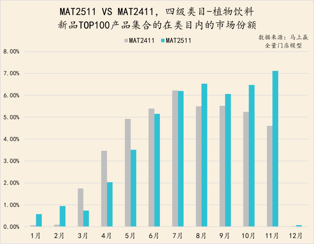 具体到植物饮料类目情况则有所不同。MAT2511的TOP新品集合市场份额表现要好于MAT2411的TOP新品表现,且在气温转凉的10月、11月依然展现出了进一步增长的趋势,或是在热饮适配方面有更好的表现。