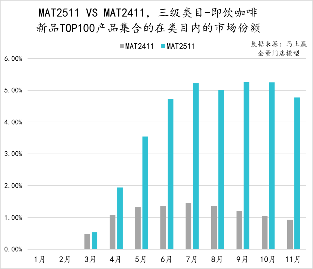 从即饮咖啡类目中,TOP100新品的市场表现来看,相比MAT2411,MAT2511的表现明显更好,新品集合自4月起市场份额就超过了MAT2411新品的表现。同时,类目中的TOP新品集合在2025年11月已经占据了5%左右的市场份额,新品成长性表现较好。