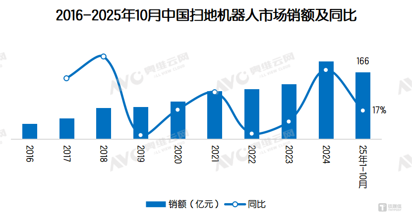 不同于电视、空调、冰箱,扫地机落地时间较短,仍处于规模化普及阶段。近两年,在技术迭代以及国补等政策性因素的推动下,扫地机迎来了快速增长,带动清洁电器的增速远超家电市场的大盘。奥维云网(AVC)监测数据显示,2025年1-10月,扫地机器人行业累计销额达166亿元,同比增长17%;零售量528万台,同比增长18.5%,行业呈现量额齐升的亮眼态势。