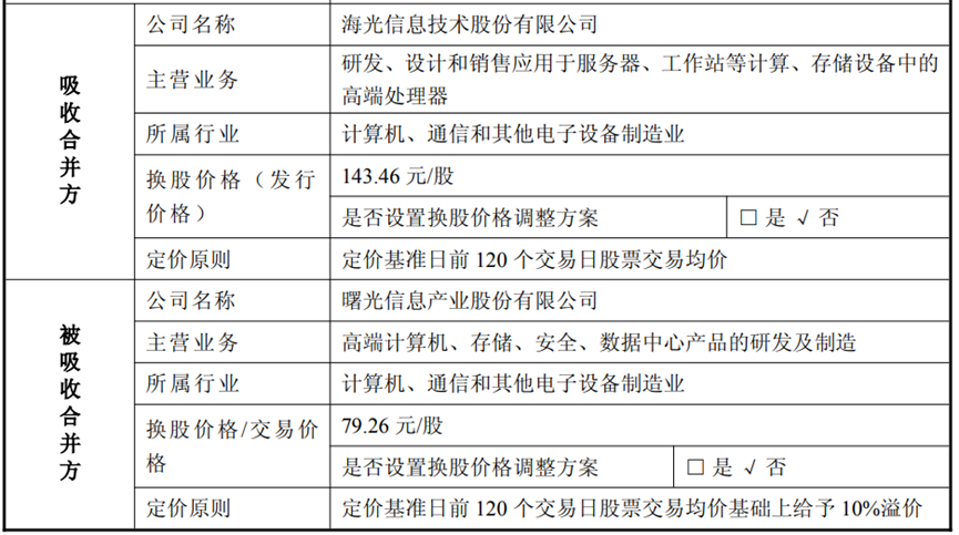 海光信息为吸收合并方,中科曙光为被吸收合并方,即海光信息向中科曙光的全体换股股东发行A股股票,交换该等股东所持有的中科曙光股票。